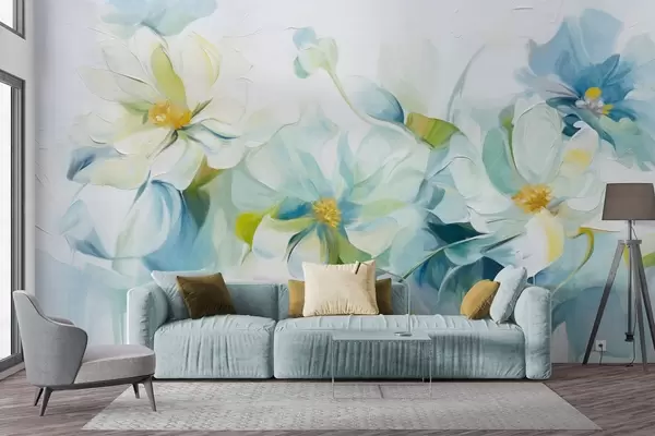 murais de parede Flores abstratas brancas e azuis com pistilos amarelos e folhas verdes, em um fundo branco, estilo de pintura texturizada w09372