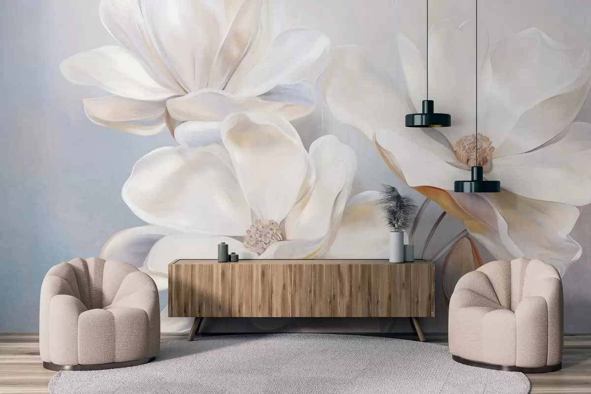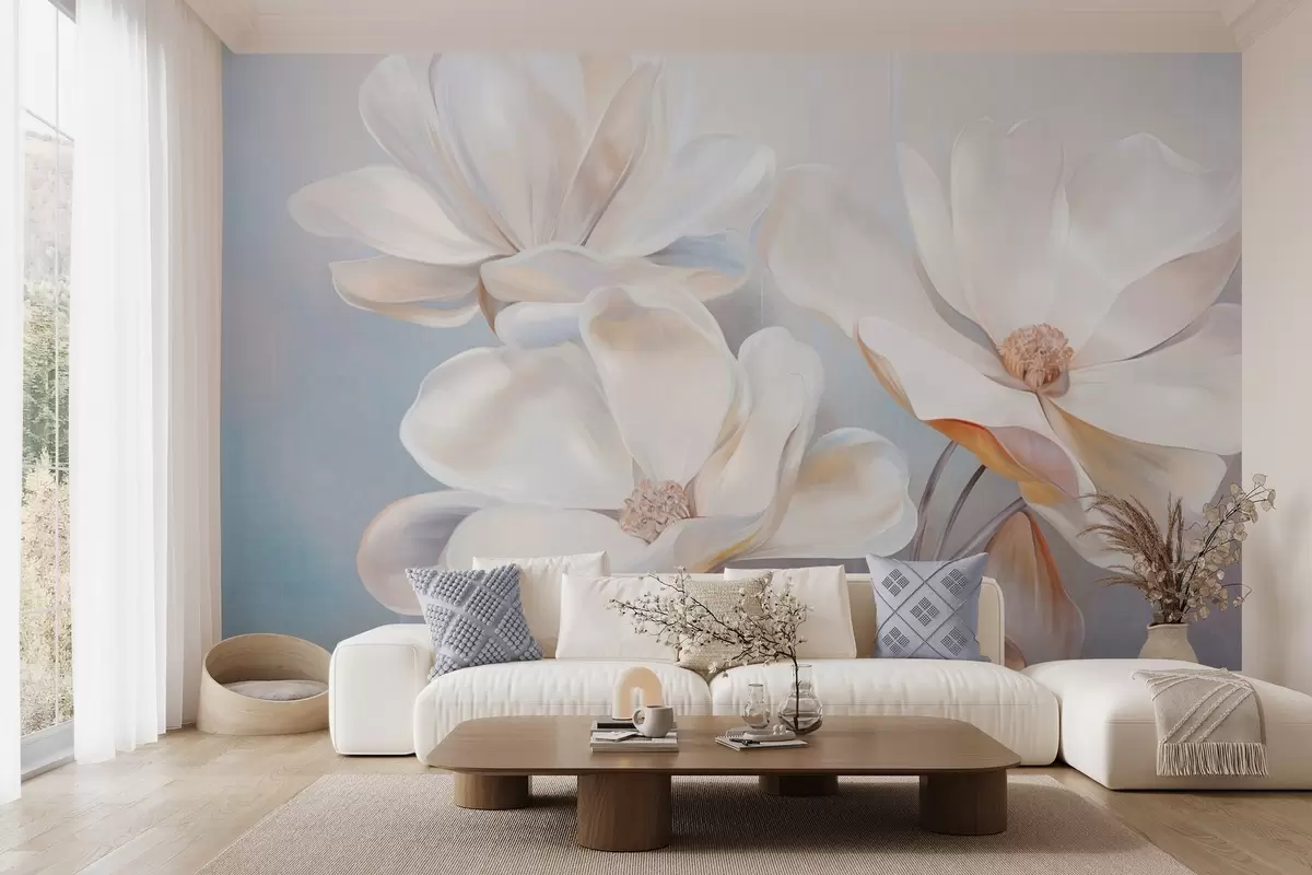 Murais de parede Flores brancas de magnólia fantasia com pétalas delicadas e texturadas, um fundo suave e abstrato Nr. w09373