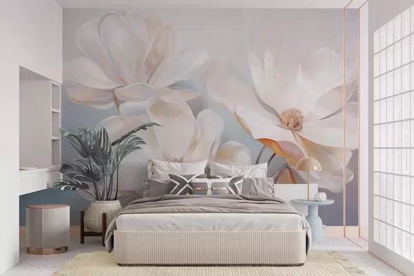 Murais de parede Flores brancas de magnólia fantasia com pétalas delicadas e texturadas, um fundo suave e abstrato Nr. w09373