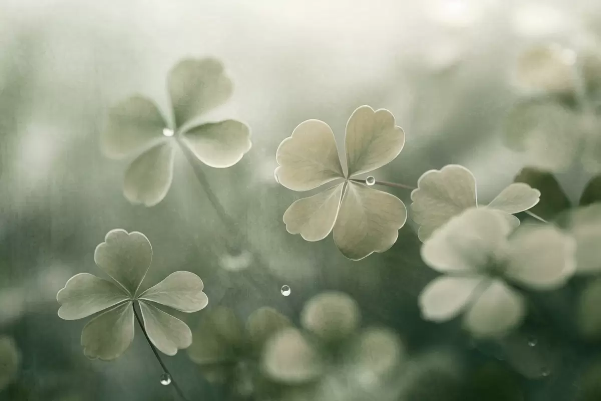 Murais de parede Trevos de quatro folhas com gotas de água, cor verde claro, foco suave, fundo desfocado, impressão texturizada Nr. w09376