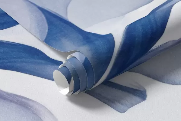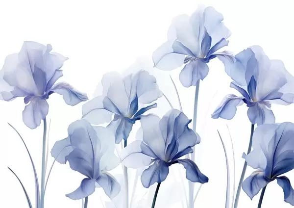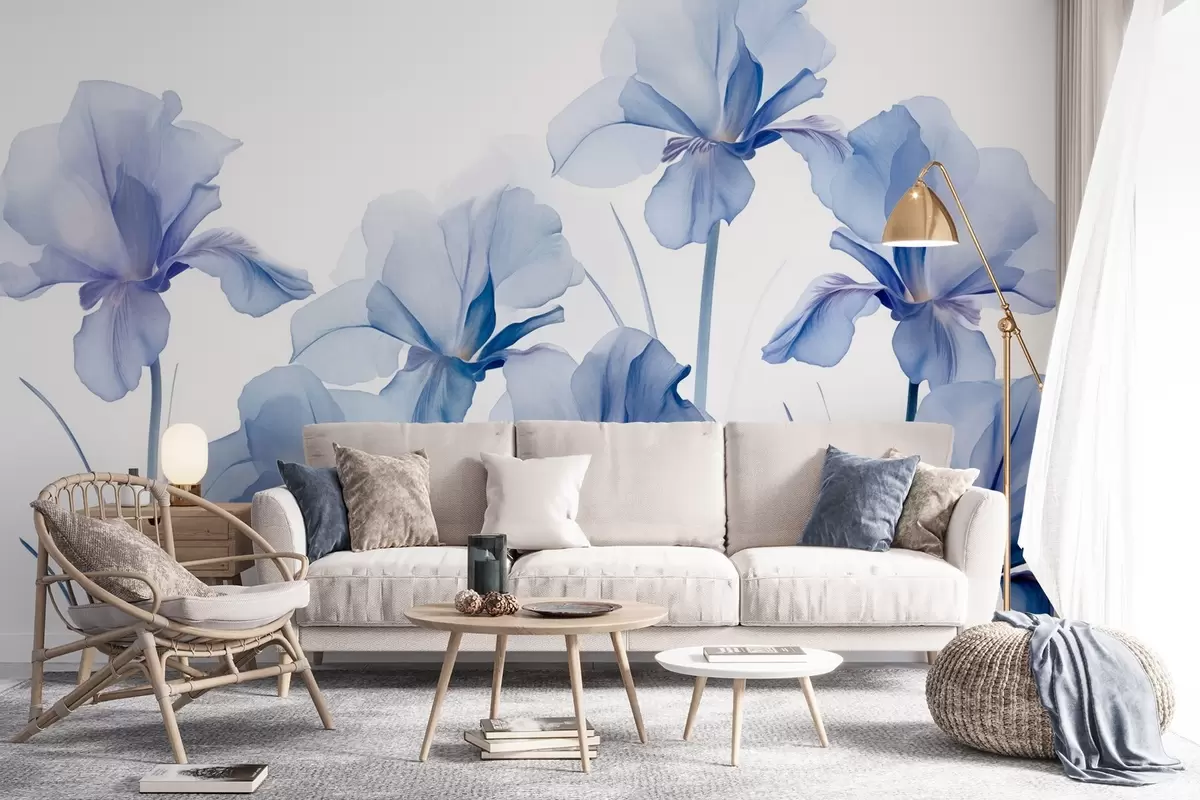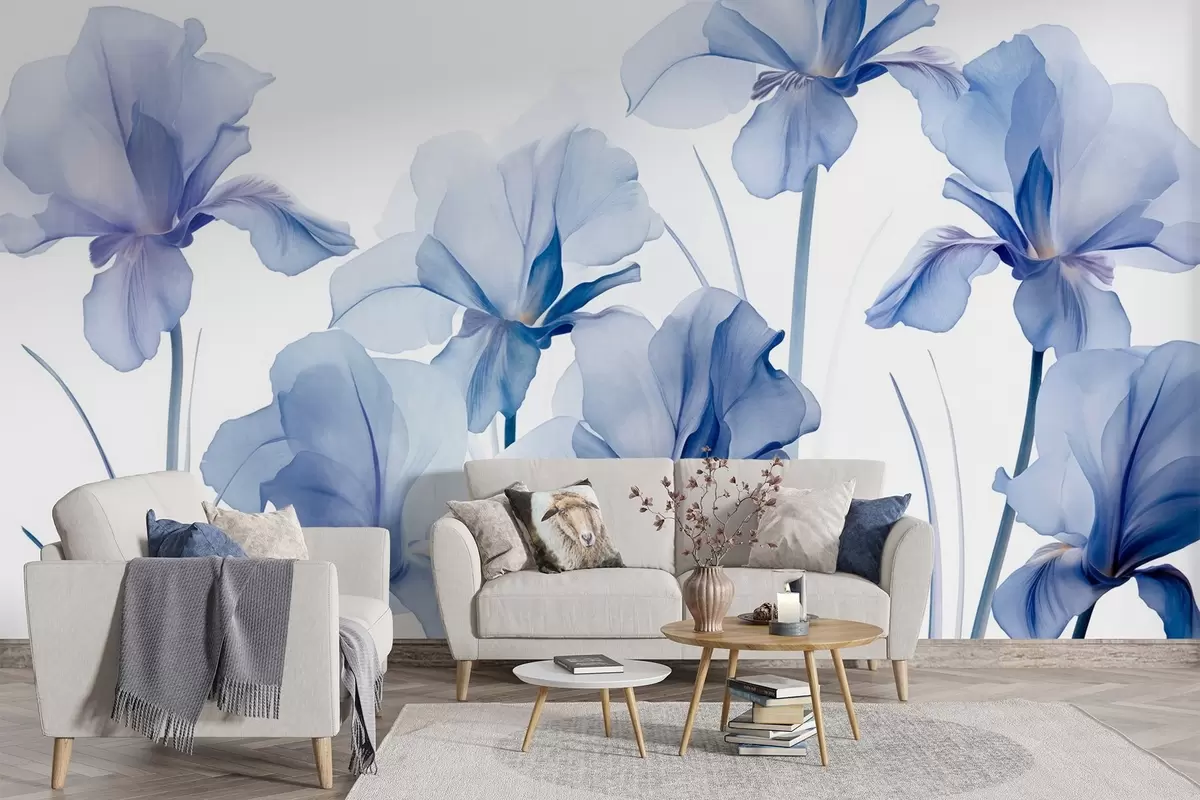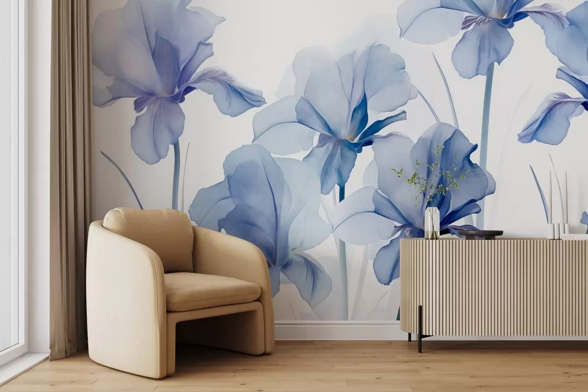 Murais de parede Flores de íris azul com pétalas translúcidas e hastes longas, dispostas em uma fileira contra um fundo azul, suave e texturizado Nr. w09379