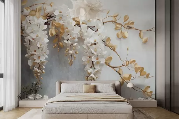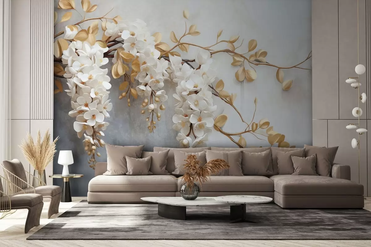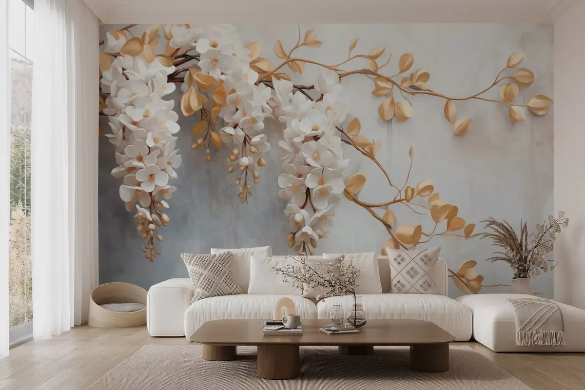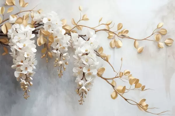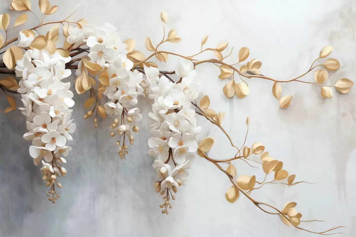 Murais de parede Flores brancas de glicínias com folhas amarelas em um galho, caindo em cascata em um fundo branco texturizado, pétalas delicadas Nr. w09381