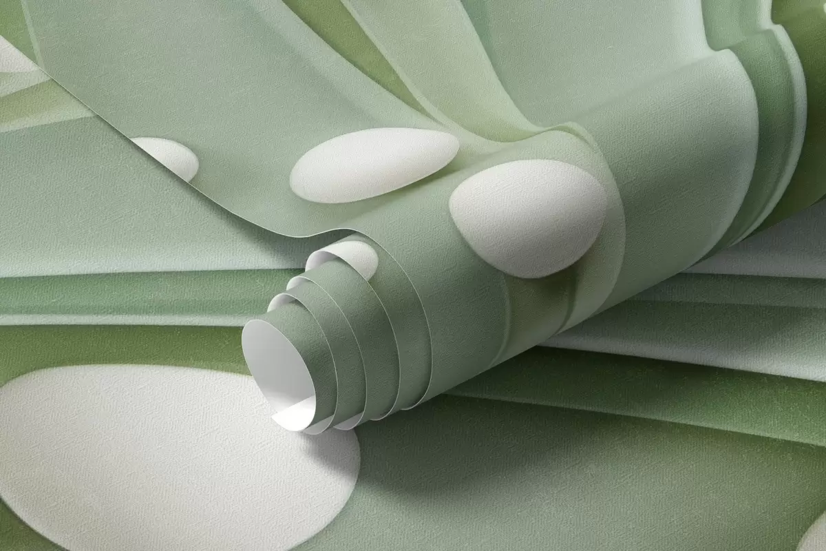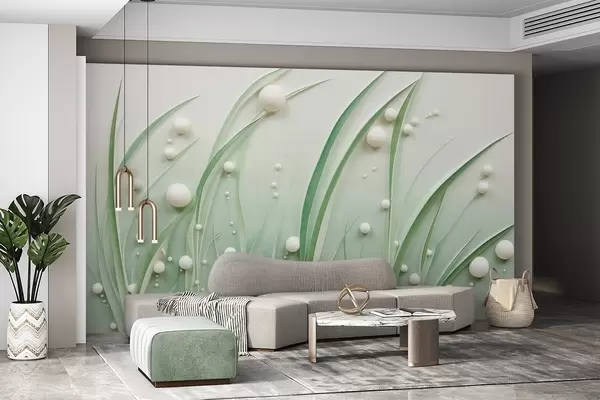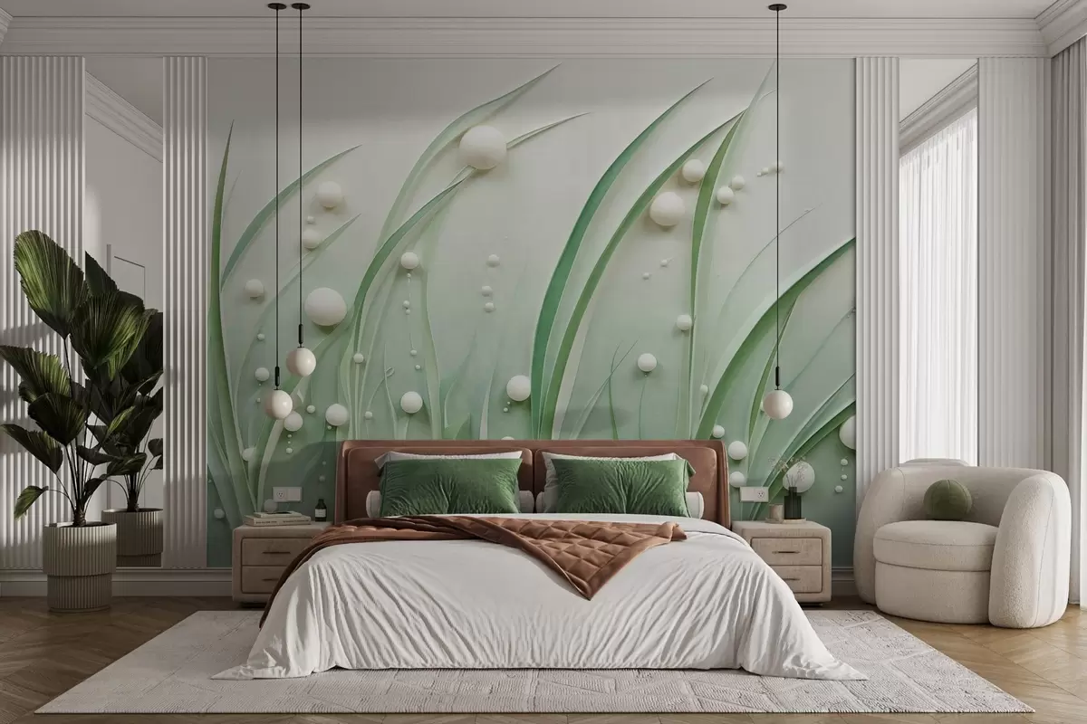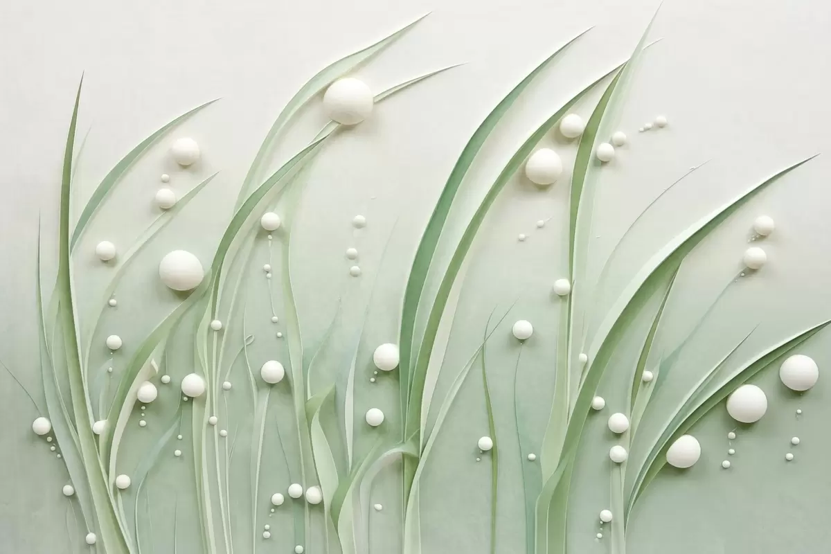 Murais de parede Grama verde abstrata com esferas brancas, fundo verde claro, texturizado, linhas limpas, estilo minimalista Nr. w09382