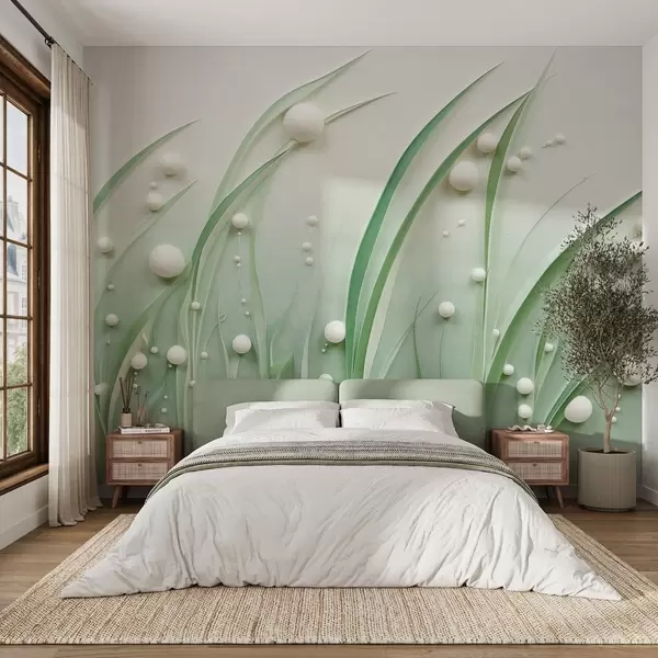 Murais de parede Grama verde abstrata com esferas brancas, fundo verde claro, texturizado, linhas limpas, estilo minimalista Nr. w09382