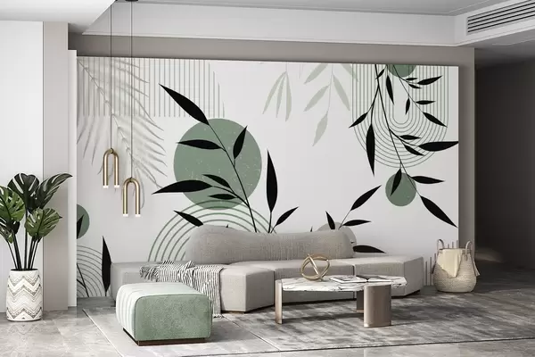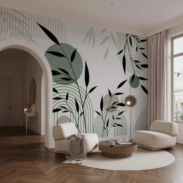 Murais de parede Impressão abstrata texturizada com formas geométricas, círculos e arcos e plantas pretas e verdes em um fundo branco Nr. w09384