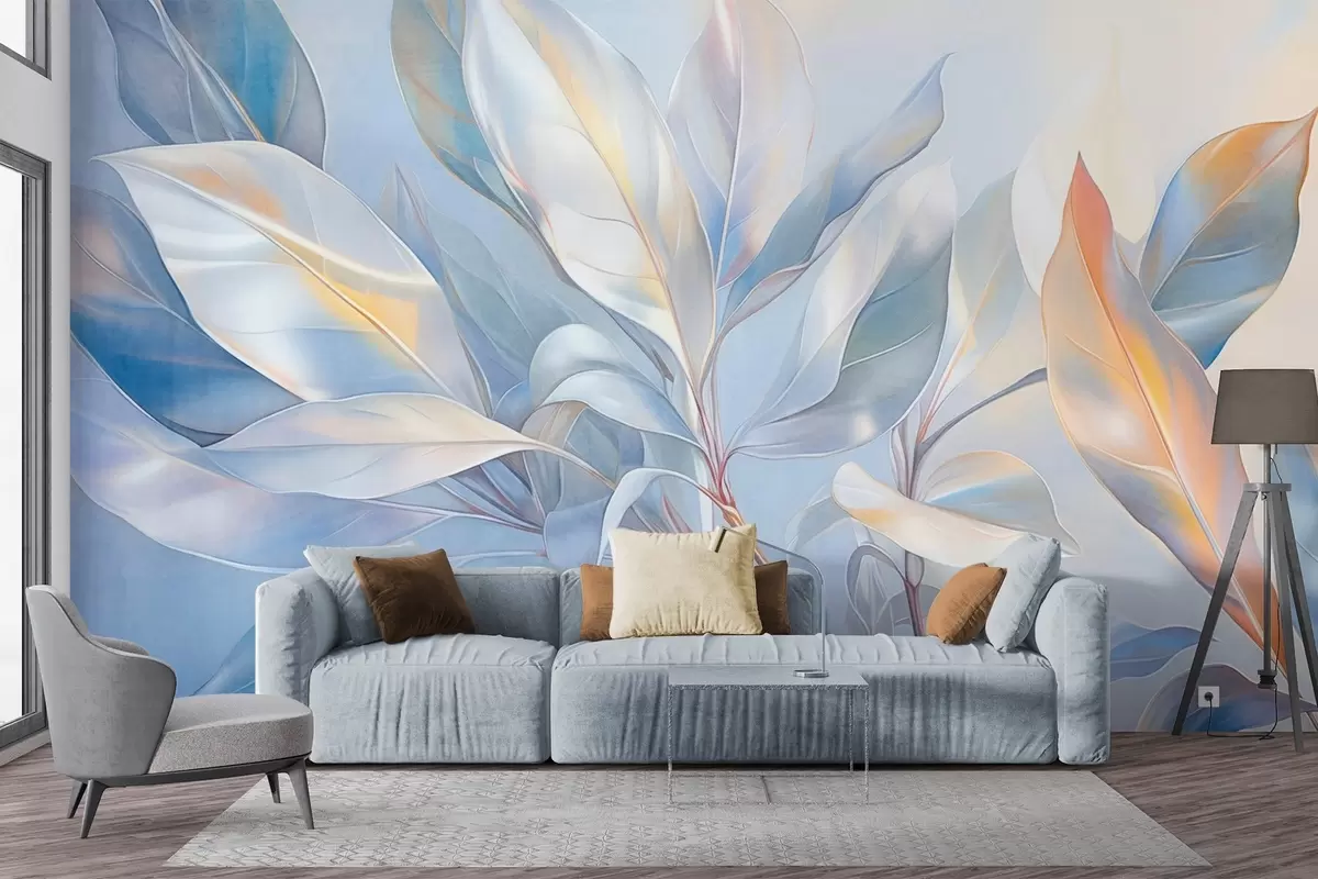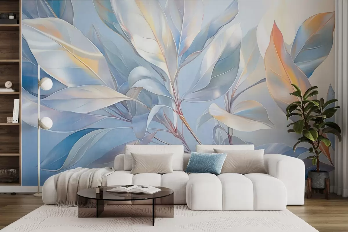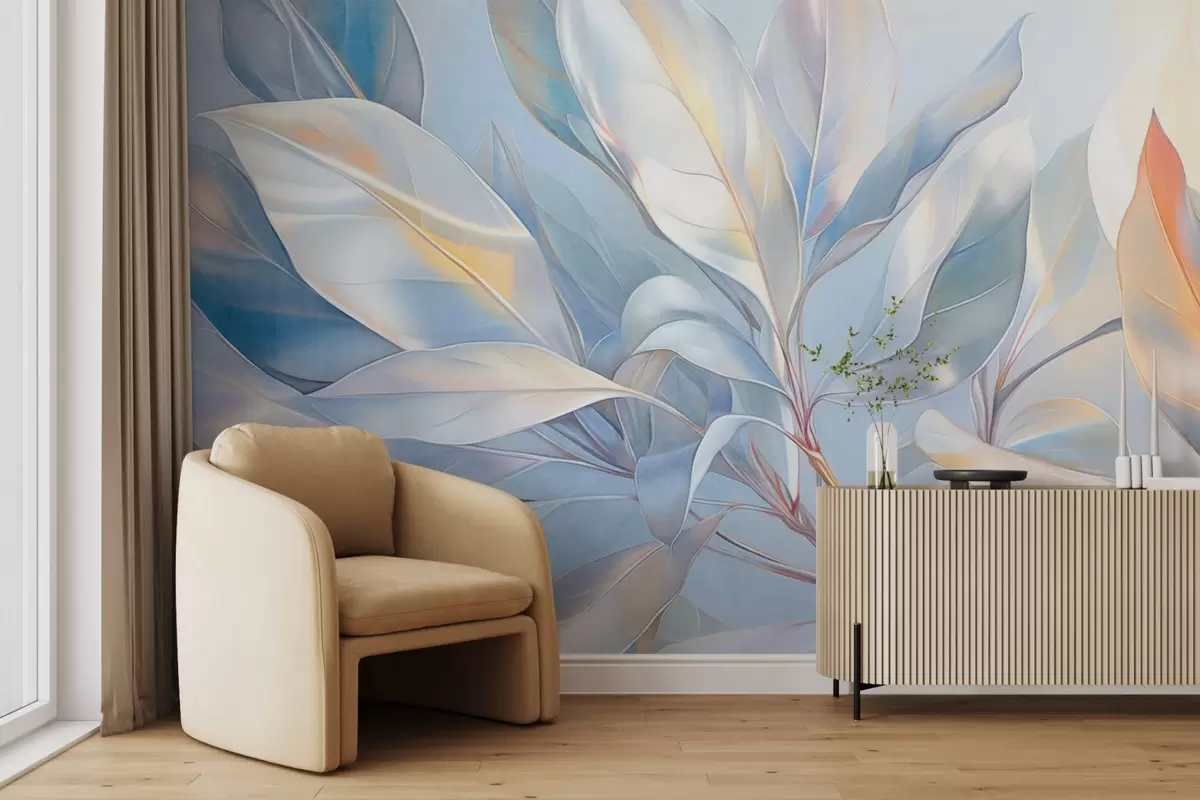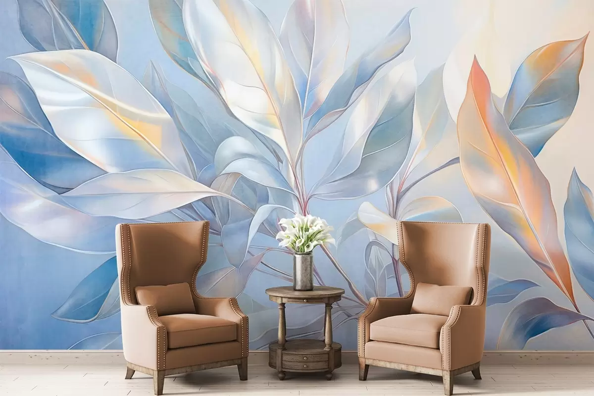 Murais de parede Folhas de magnólia com tons de branco e azul, iluminação suave, composição elegante, veios detalhados das folhas, pinceladas artísticas Nr. w09385