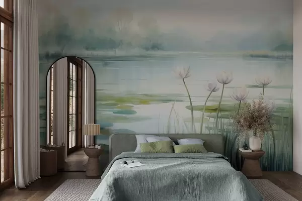 Murais de parede Paisagem com um lago, nenúfares e folhas de nenúfar, árvores ao fundo, num ambiente tranquilo, tons de azul claro e verde Nr. w09395