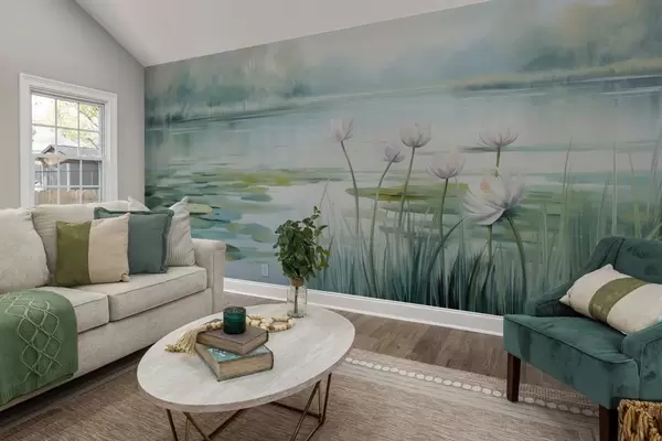 Murais de parede Paisagem com um lago, nenúfares e folhas de nenúfar, árvores ao fundo, num ambiente tranquilo, tons de azul claro e verde Nr. w09395