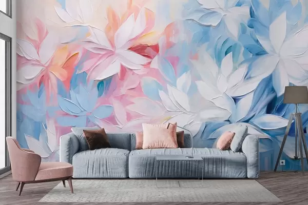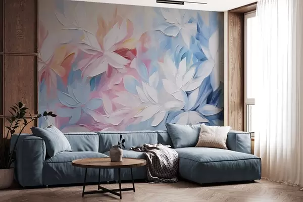 Murais de parede Flores brancas texturizadas com folhas rosa e azuis, pintura a óleo em estilo abstrato, pinceladas suaves, cores pastel Nr. w09396