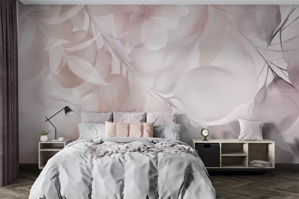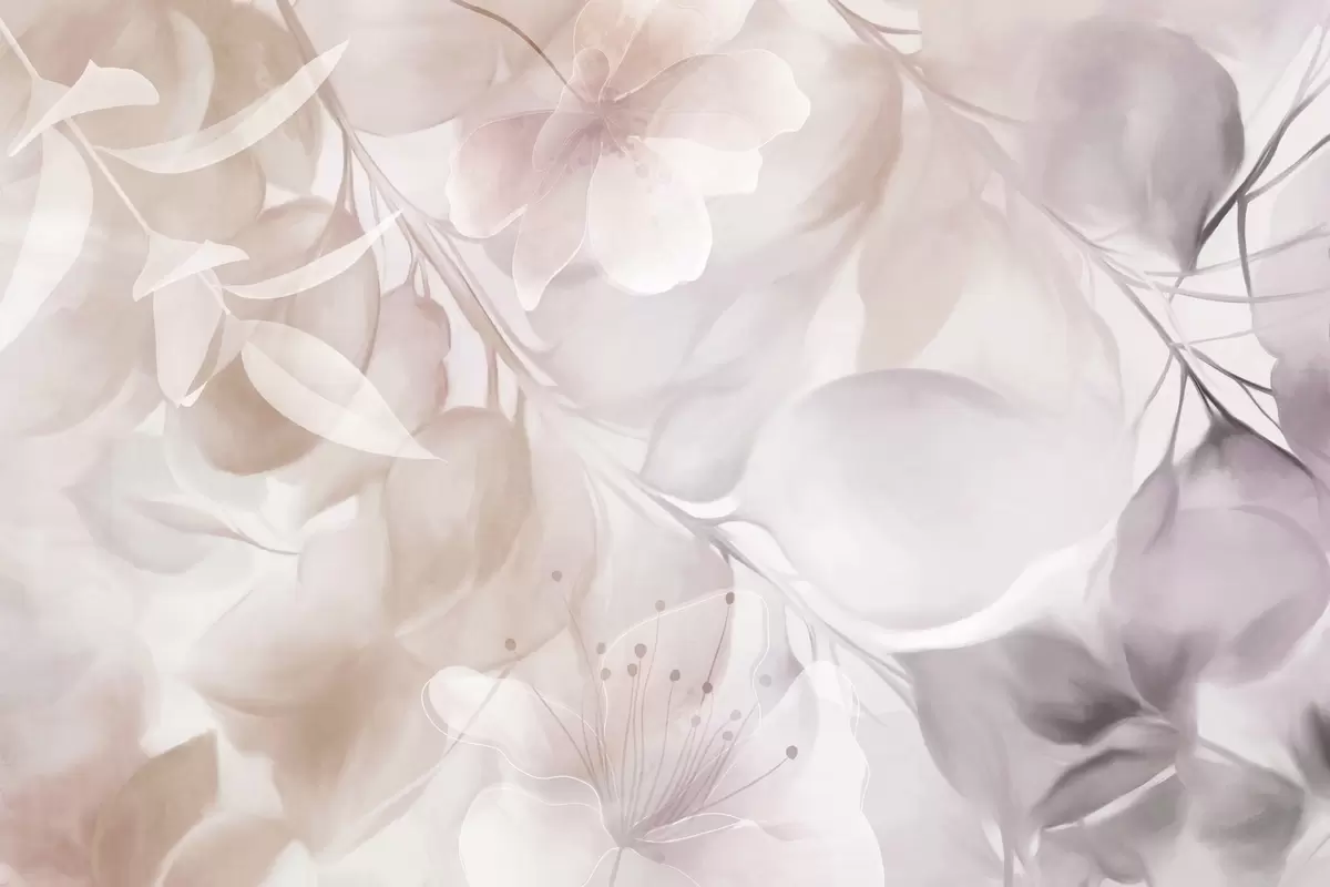 Murais de parede Arte floral com flores, folhas e galhos em tons suaves de bege e marrom, cores pastéis suaves, efeito texturizado de aquarela Nr. w09397