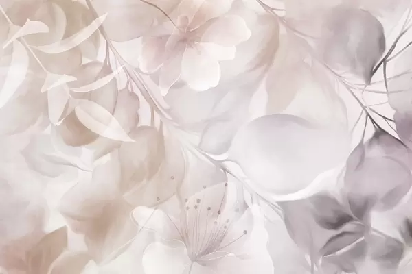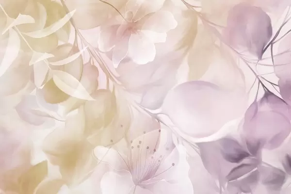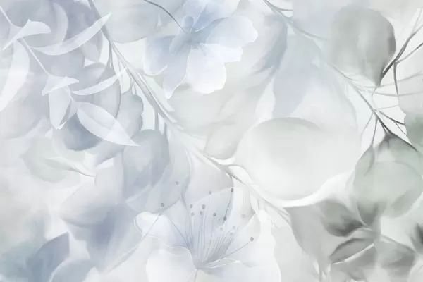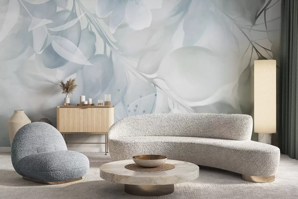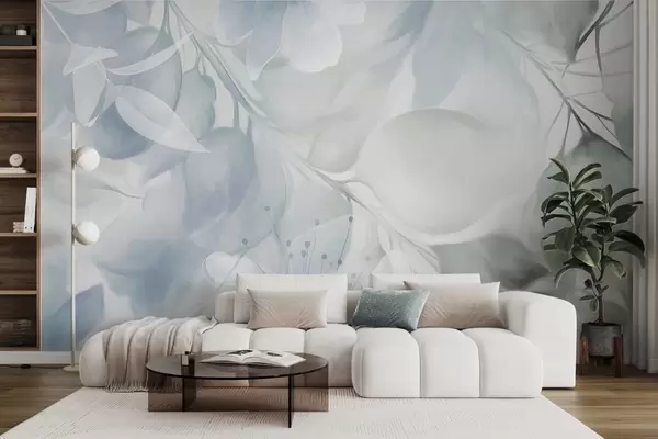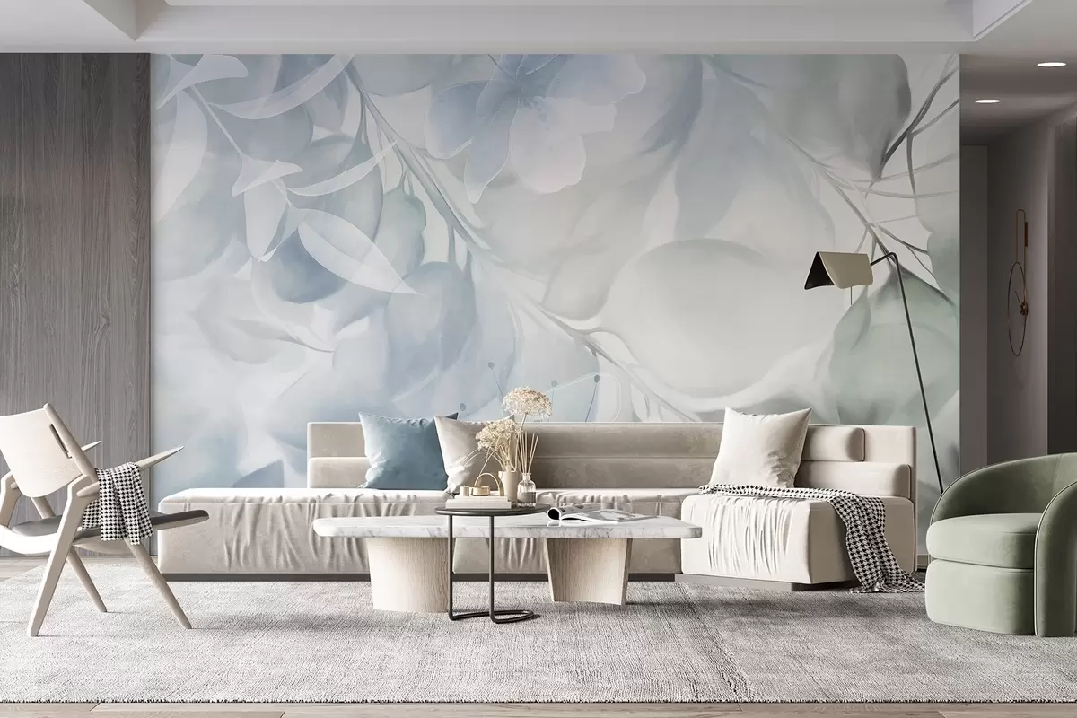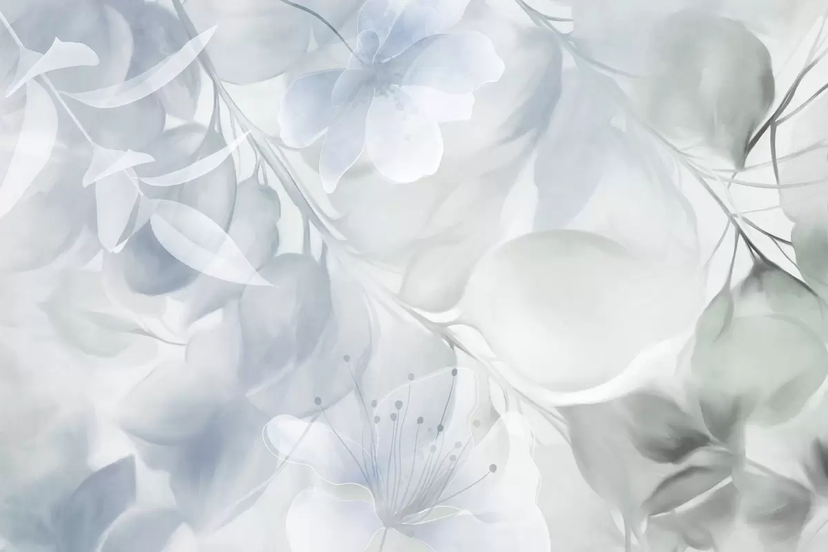Murais de parede Arte floral com flores, folhas e ramos em tons suaves de azul e verde, cores pastel suaves, efeito texturado de aquarela Nr. w09397v1