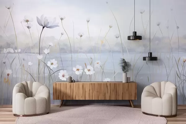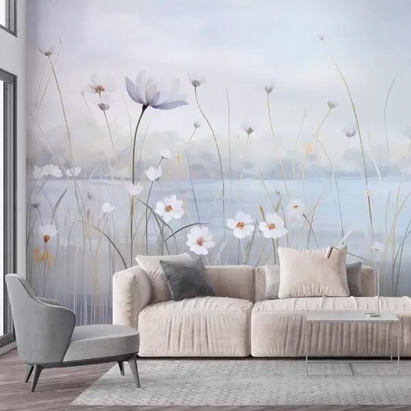 Murais de parede Flores brancas com hastes longas em um campo, céu azul claro, cores suaves, texturizadas, estilo minimalista, inspirado na natureza, fundo calmo Nr. w09401