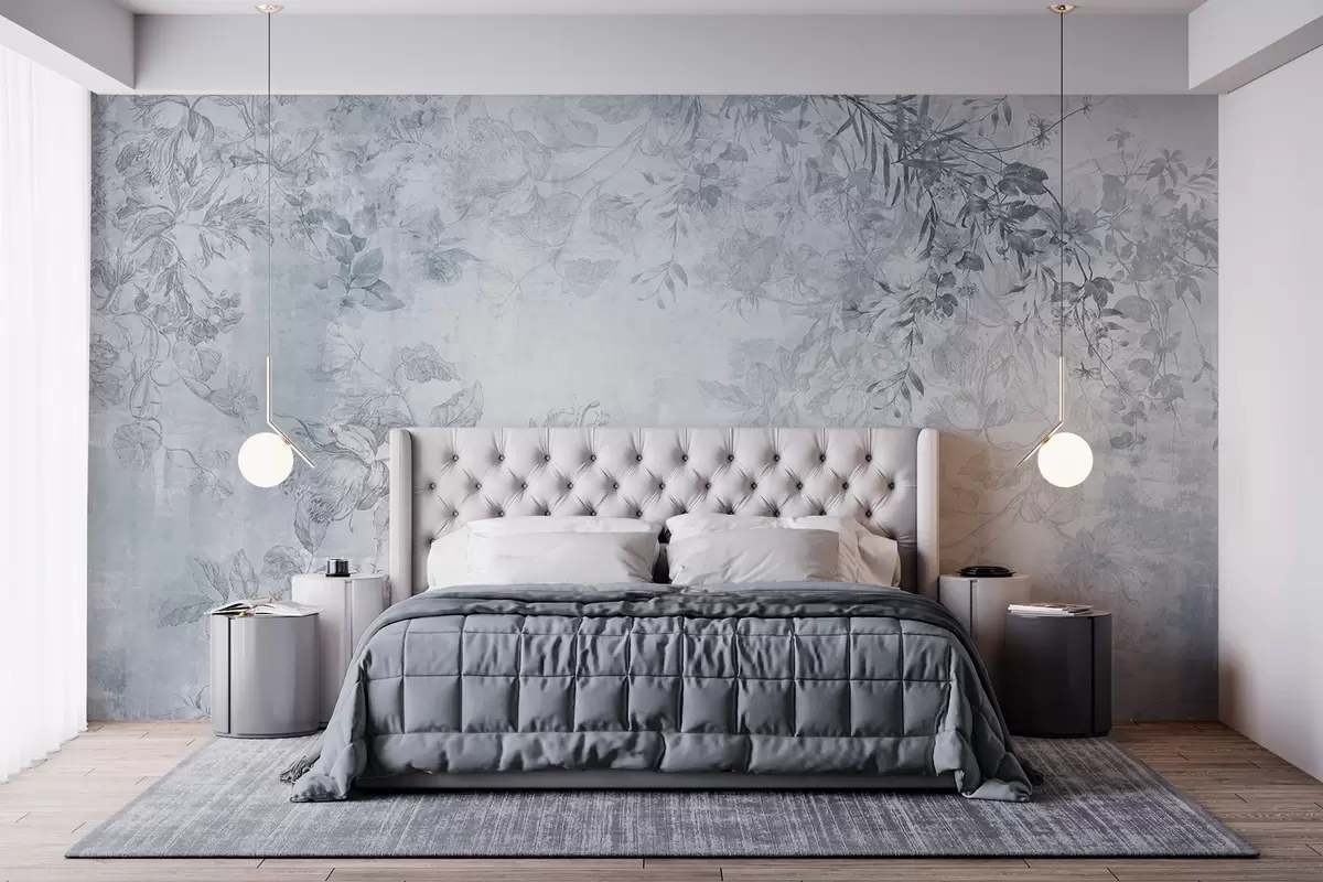 Murais de parede Arte floral vintage texturizada com ilustrações delicadas de flores e folhas de jardim em estilo desenho, tons suaves de azul Nr. w09402v1