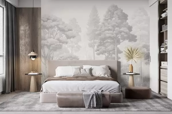 murais de parede Paisagem florestal artística na técnica de hachura gráfica em preto e branco w09411