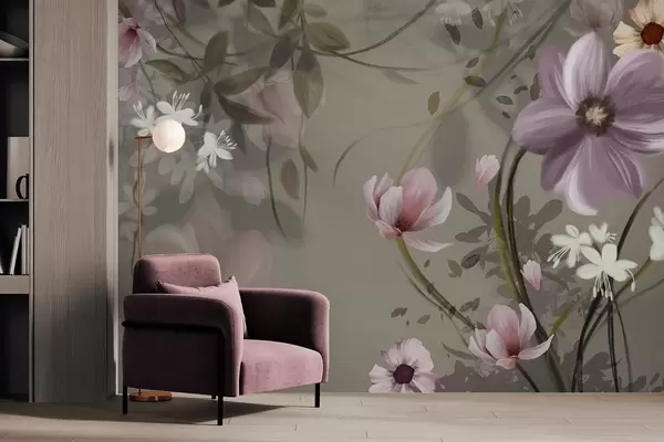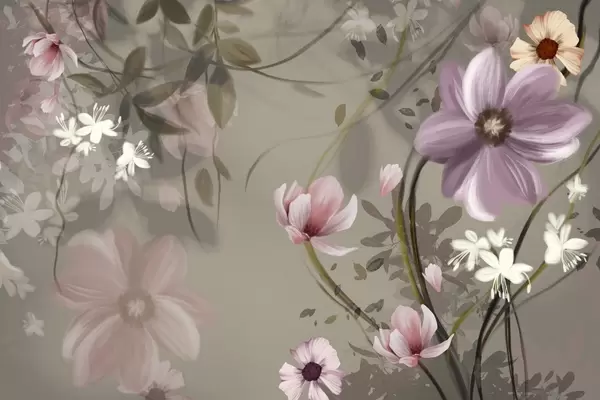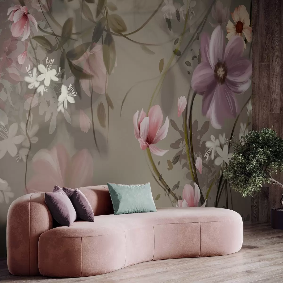 Murais de parede Flores rosa e brancas com caules e folhas marrons, iluminação suave, cores suaves, arranjo floral Nr. w09417