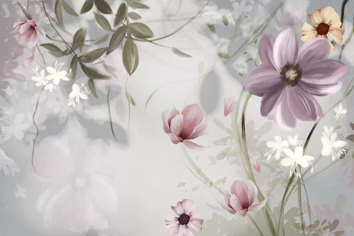 Murais de parede Flores rosa e brancas com caules e folhas verdes, iluminação suave, cores suaves, arranjo floral Nr. w09417v1