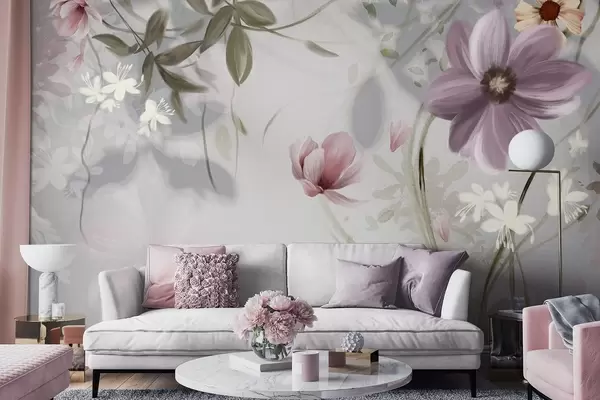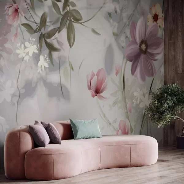 Murais de parede Flores rosa e brancas com caules e folhas verdes, iluminação suave, cores suaves, arranjo floral Nr. w09417v1