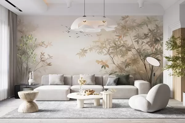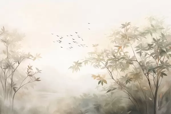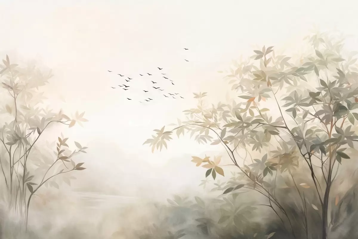 Murais de parede Paisagem texturizada com árvores e um bando de pássaros voando no céu, cores pastéis, cena da natureza Nr. w09418