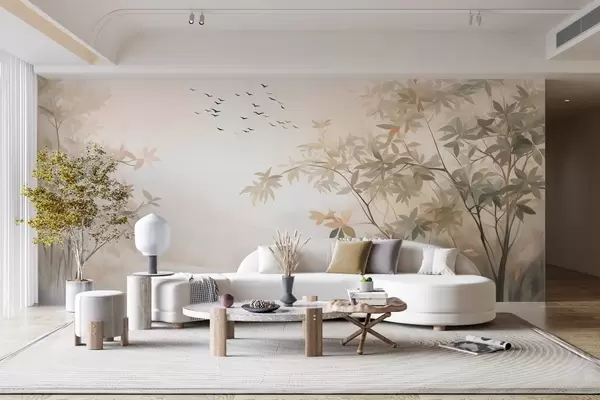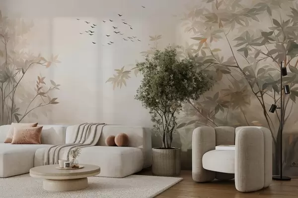 Murais de parede Paisagem texturizada com árvores e um bando de pássaros voando no céu, cores pastéis, cena da natureza Nr. w09418