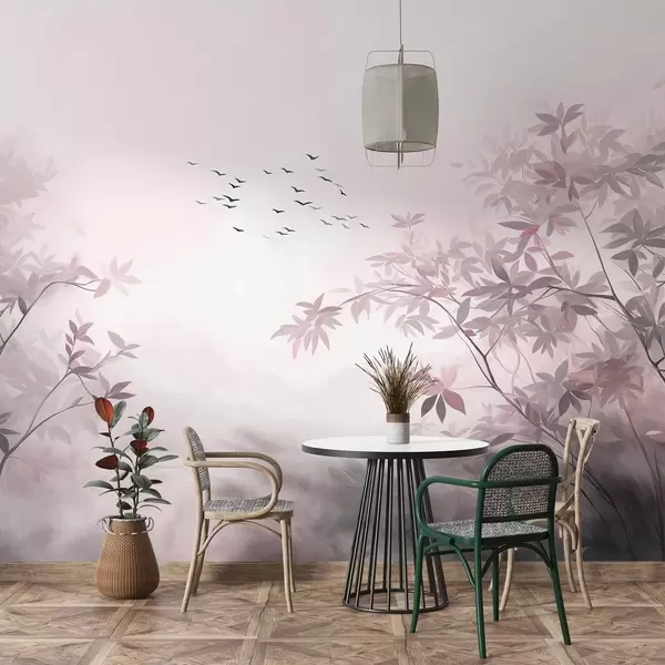 Murais de parede Paisagem texturizada com árvores e um bando de pássaros voando no céu, cores pastéis, cena da natureza Nr. w09418v1