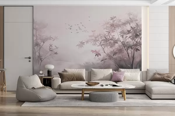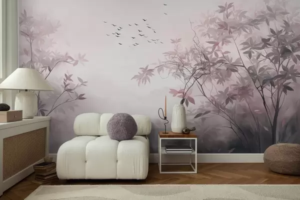 Murais de parede Paisagem texturizada com árvores e um bando de pássaros voando no céu, cores pastéis, cena da natureza Nr. w09418v1