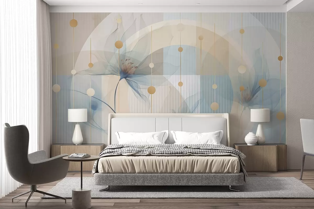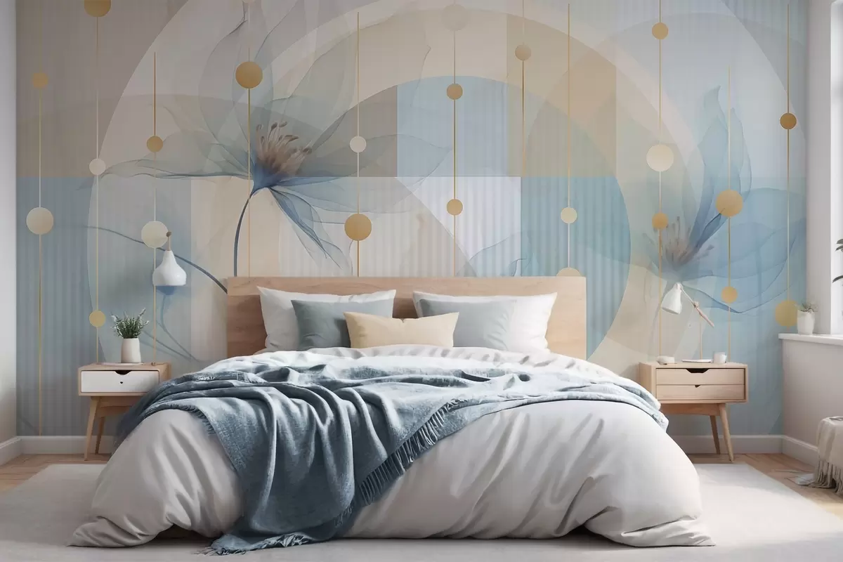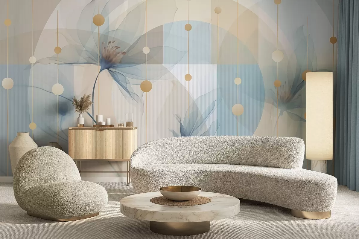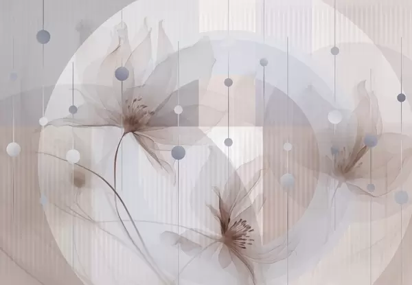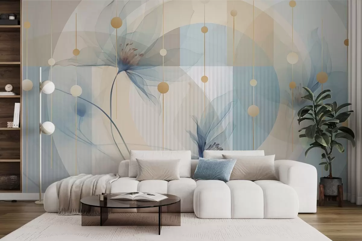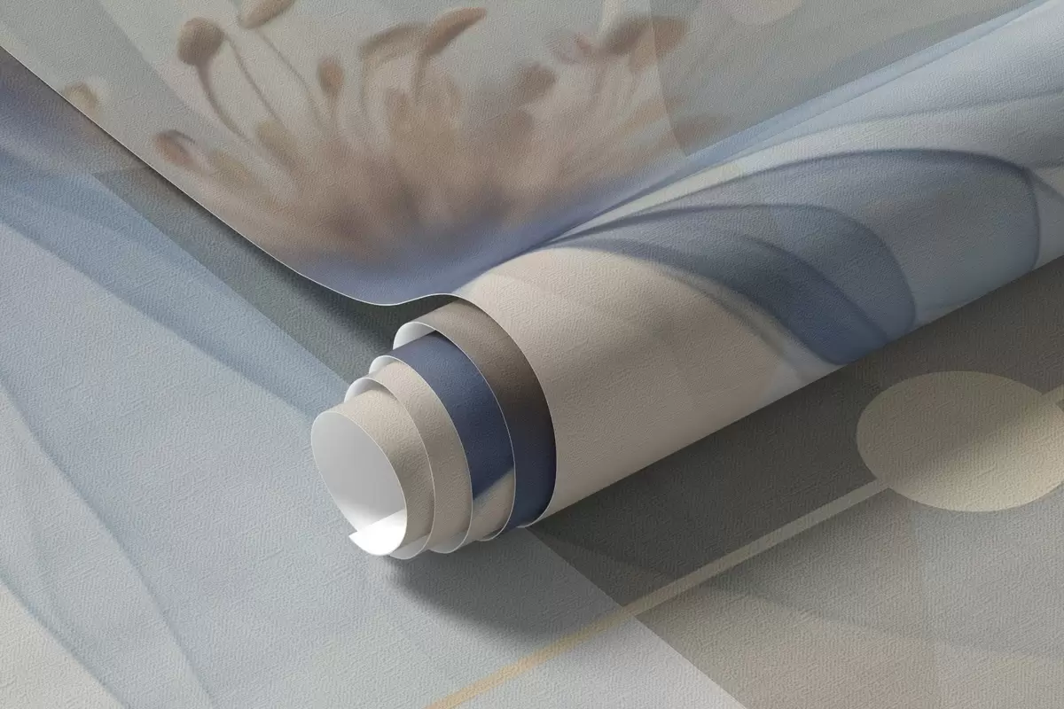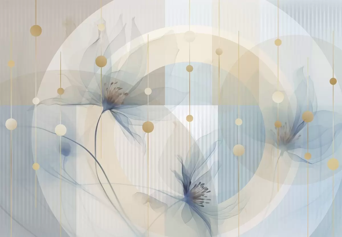 Murais de parede Flores abstratas translúcidas, círculos e formas geométricas, paleta de cores em azul pastel, bege e branco Nr. w09419
