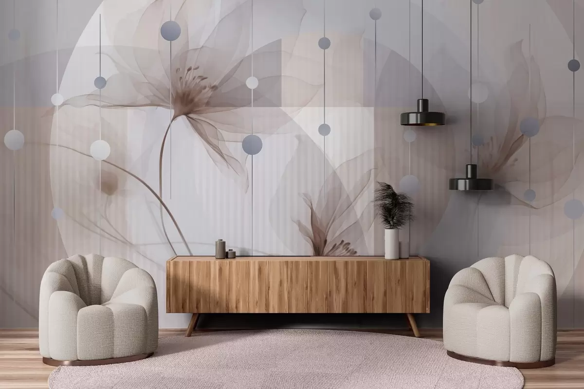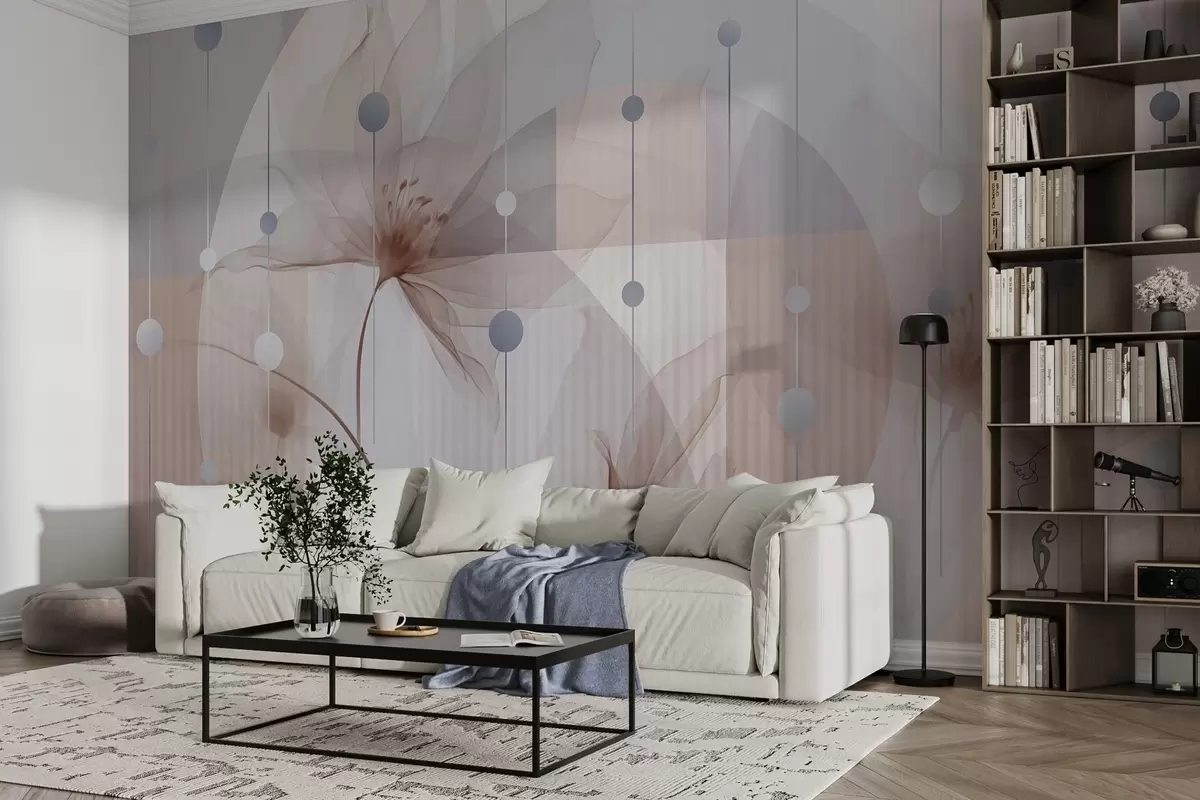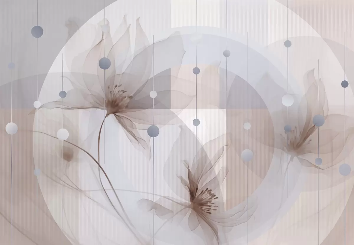 Murais de parede Flores abstratas translúcidas, círculos e formas geométricas, paleta de cores em tons pastel de azul, marrom e branco Nr. w09419v1