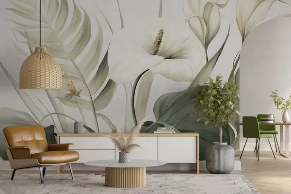 Murais de parede Calla lilies brancas e folhas tropicais verdes, ilustração botânica, fundo claro, estilo vintage, texturizado Nr. w09423