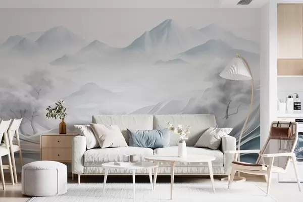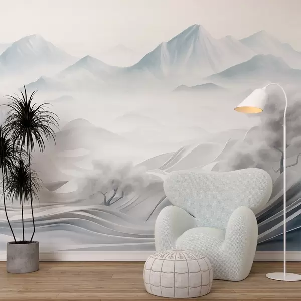 Murais de parede Paisagem montanhosa decorativa abstrata com neve, árvores brancas e neblina, estilo minimalista texturizado Nr. w09426
