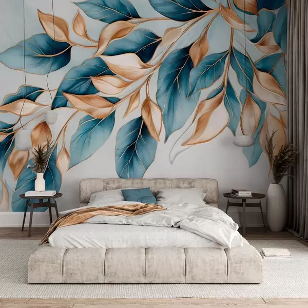 Murais de parede Folhas azuis e laranja texturizadas, fundo azul claro, design elegante e artístico, estilo moderno Nr. w09429