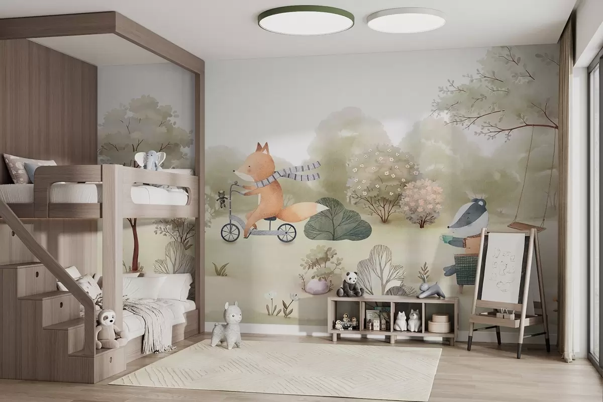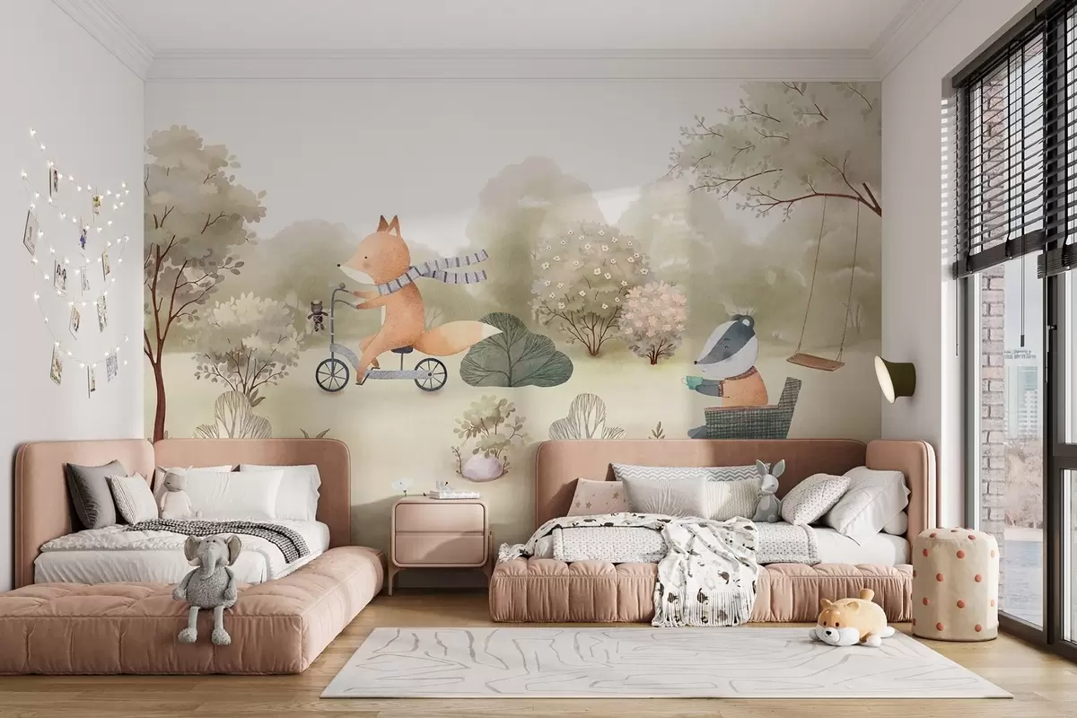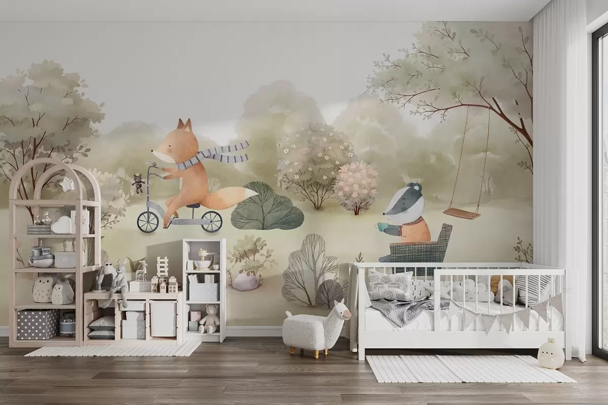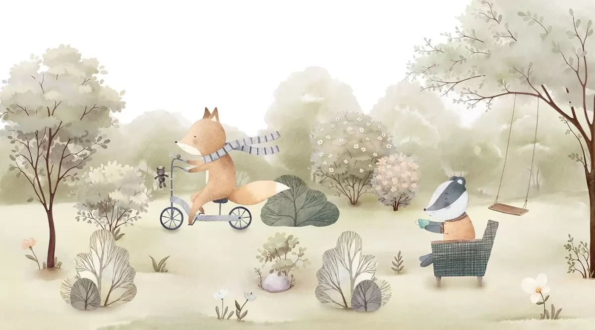 Murais de parede Raposa em uma bicicleta e texugo com chá, animais da floresta em estilo aquarela Nr. w09439