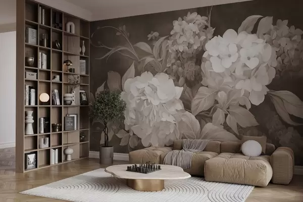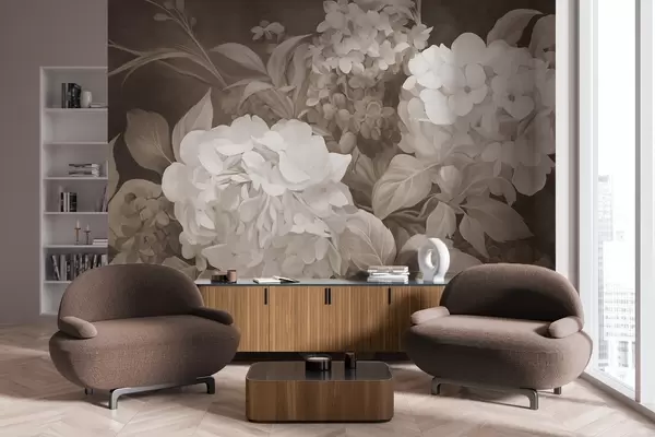 Murais de parede Pintura texturizada em sépia imitando flores de hortênsias com folhas grandes, fundo abstrato e escuro Nr. w09465
