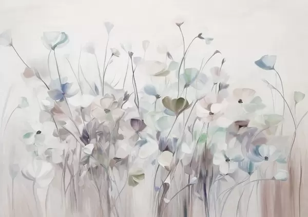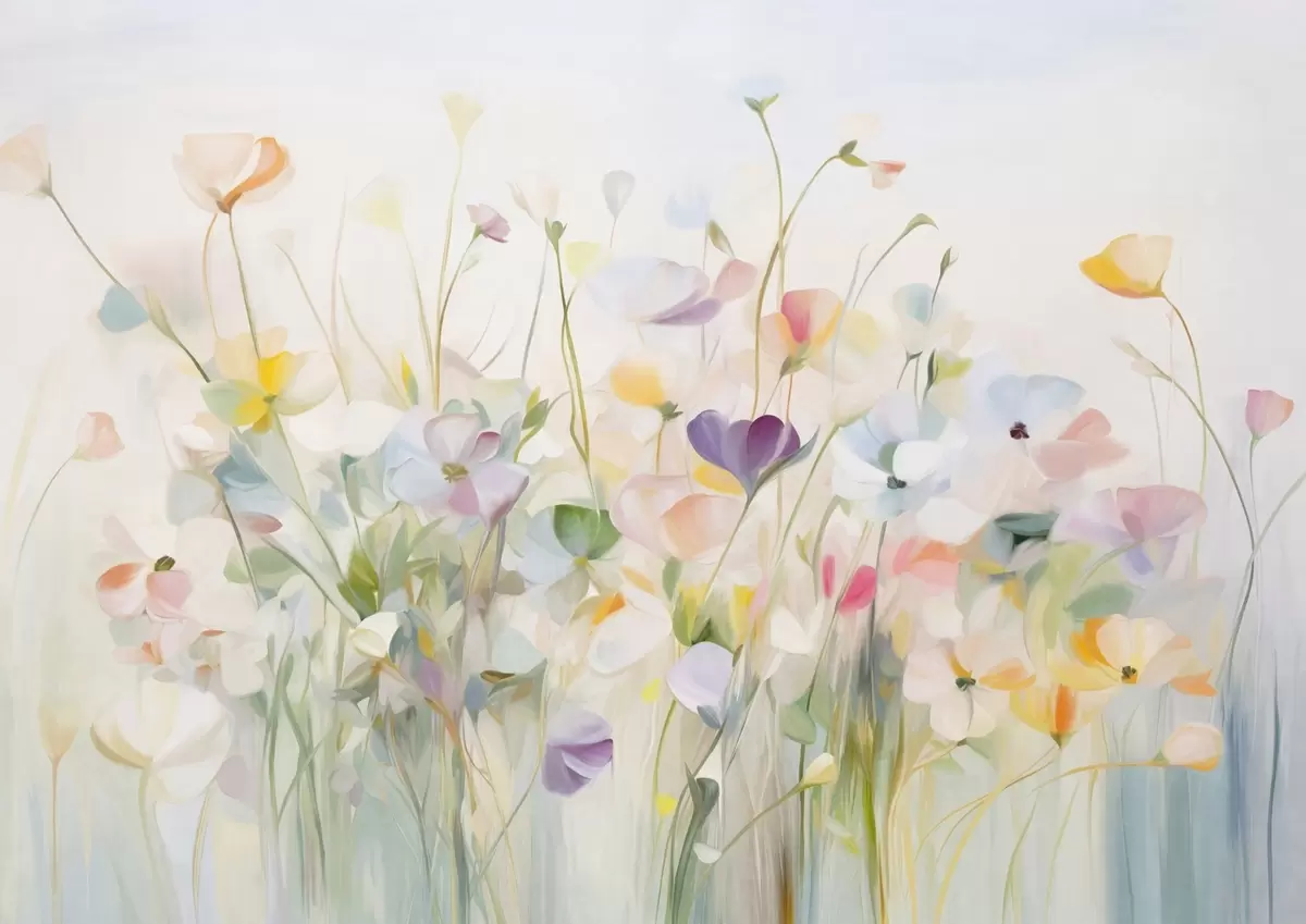 Murais de parede Campo abstrato de flores coloridas com hastes longas e folhas verdes, texturizado, em tons pastel e cores claras Nr. w09466