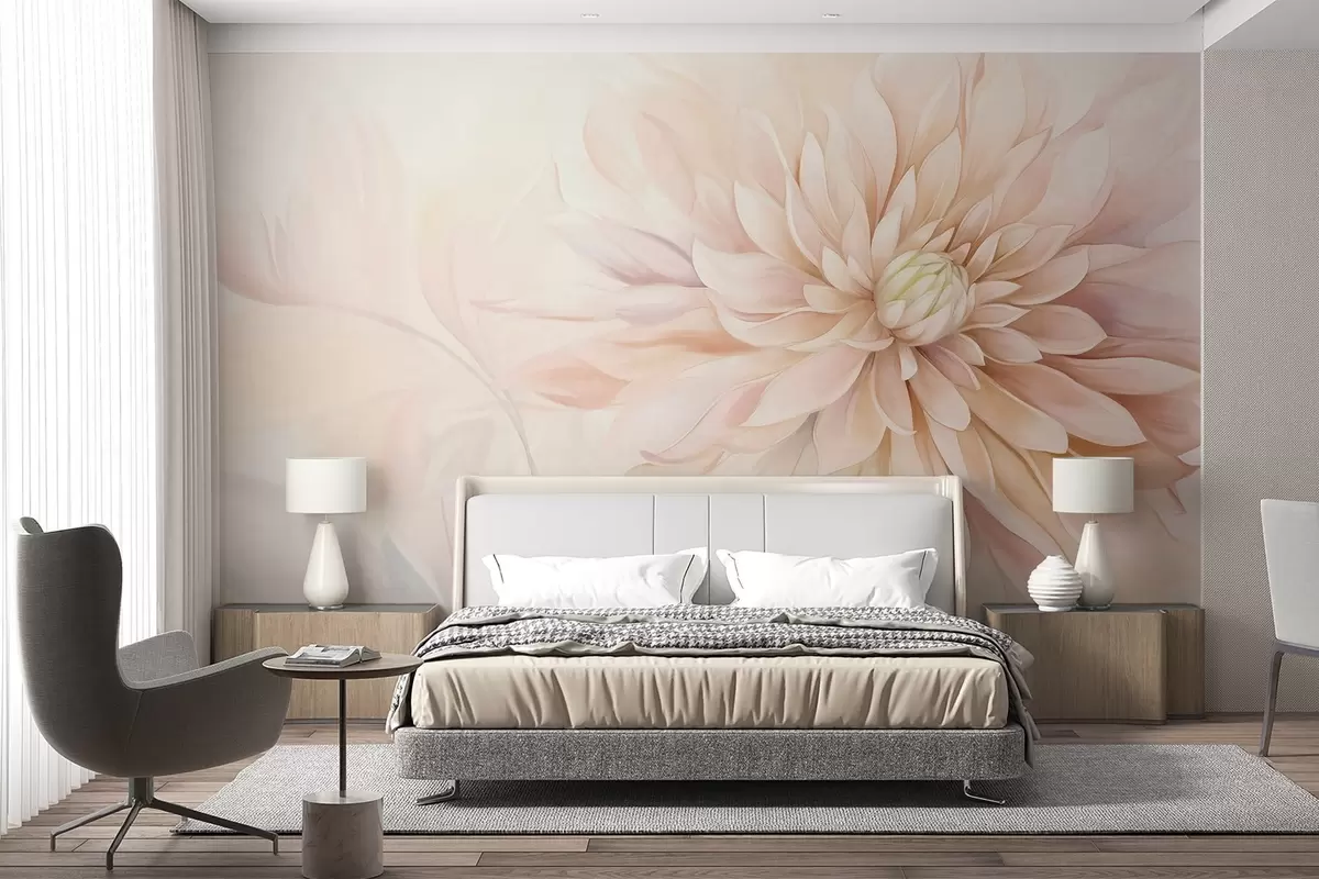 Murais de parede Uma flor de dália rosa claro com muitas pétalas, fundo pastel de textura suave com toques de verde e bege Nr. w09470