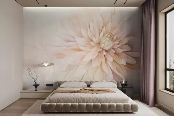 Murais de parede Uma flor de dália rosa claro com muitas pétalas, fundo pastel de textura suave com toques de verde e bege Nr. w09470