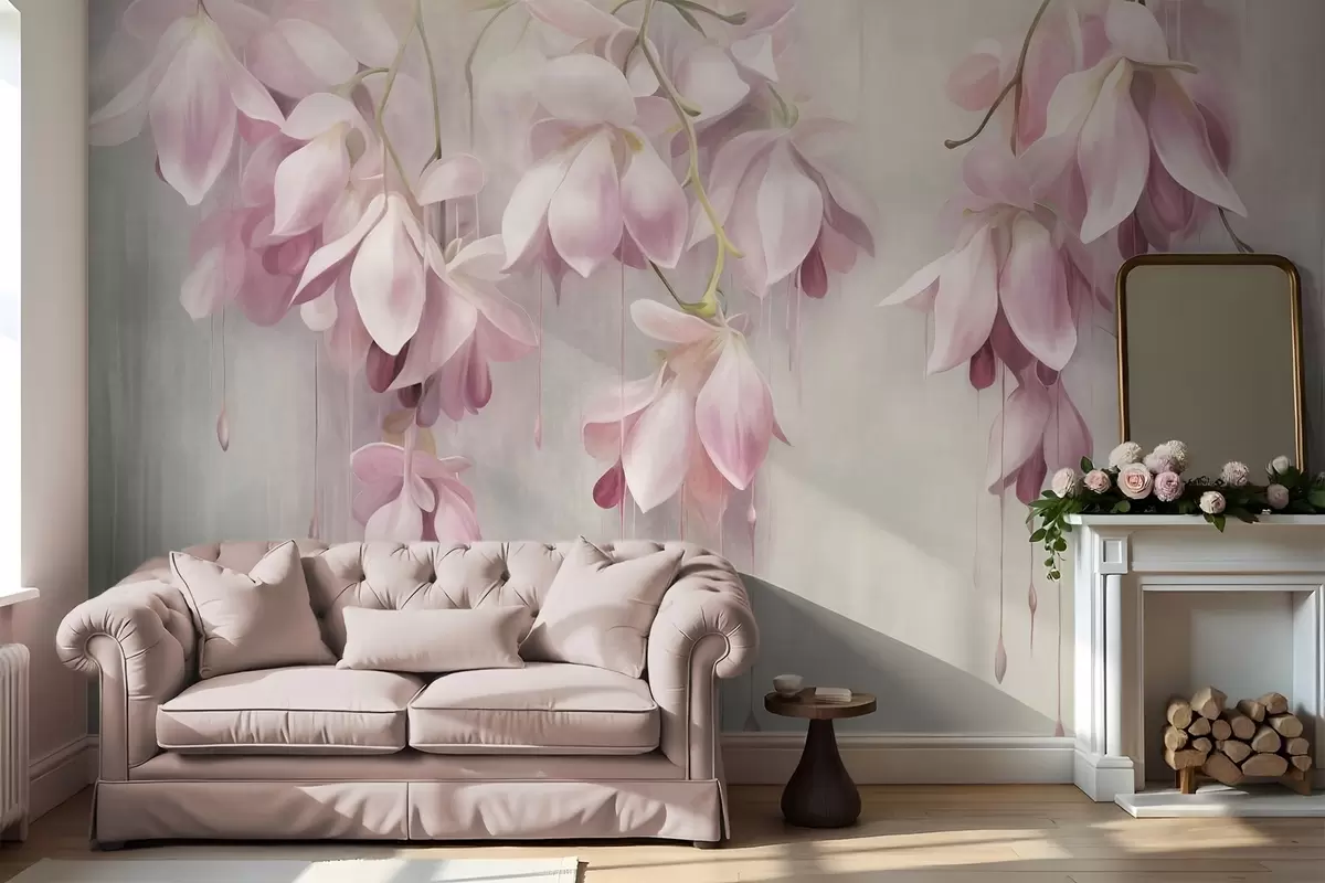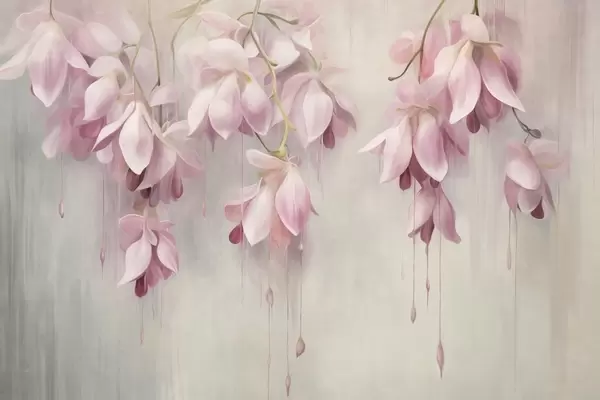 Murais de parede Flores rosa pendentes, fundo cinza claro, arranjo floral texturizado, arte botânica, cores pastel Nr. w09471