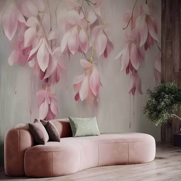 Murais de parede Flores rosa pendentes, fundo cinza claro, arranjo floral texturizado, arte botânica, cores pastel Nr. w09471