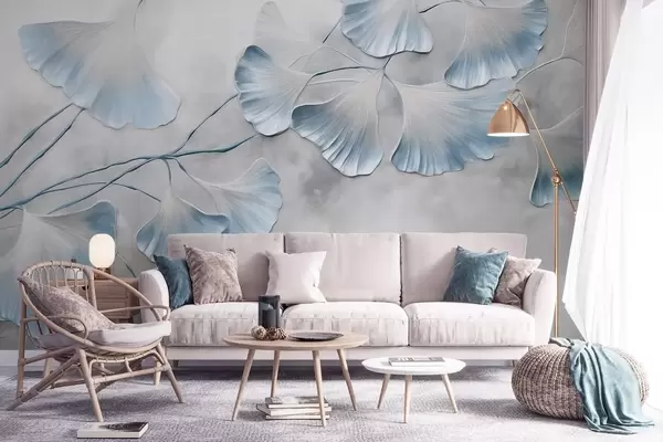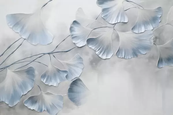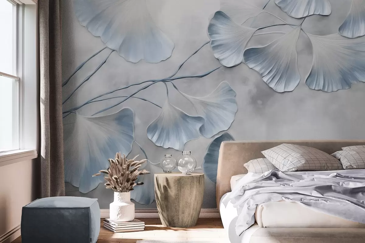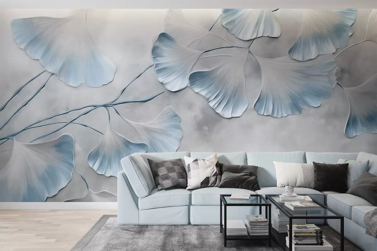 Murais de parede Folhas de ginkgo biloba com bordas azuis em um galho, fundo cinza texturizado, design elegante e minimalista Nr. w09472v1