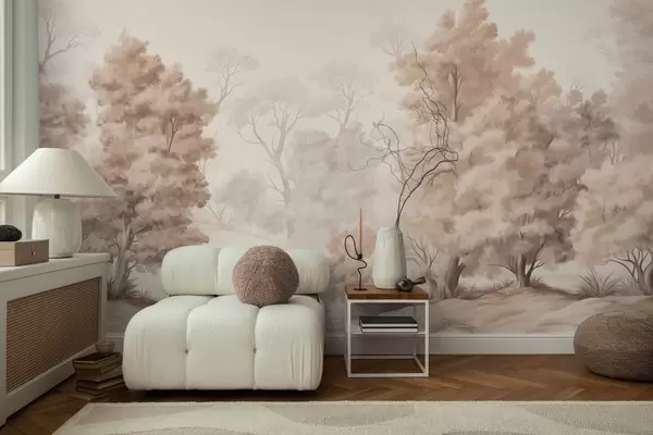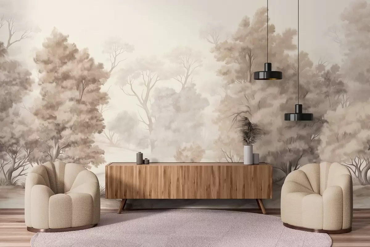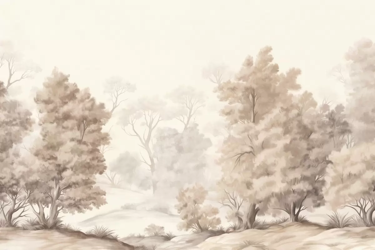 Murais de parede Pintura texturizada de paisagem imitando uma floresta com árvores altas e grama, cores suaves e discretas, cena relaxante Nr. w09474