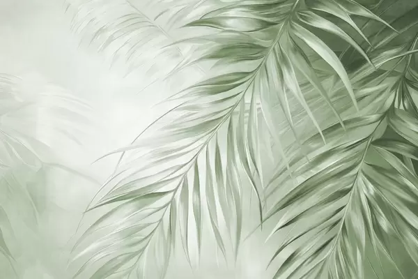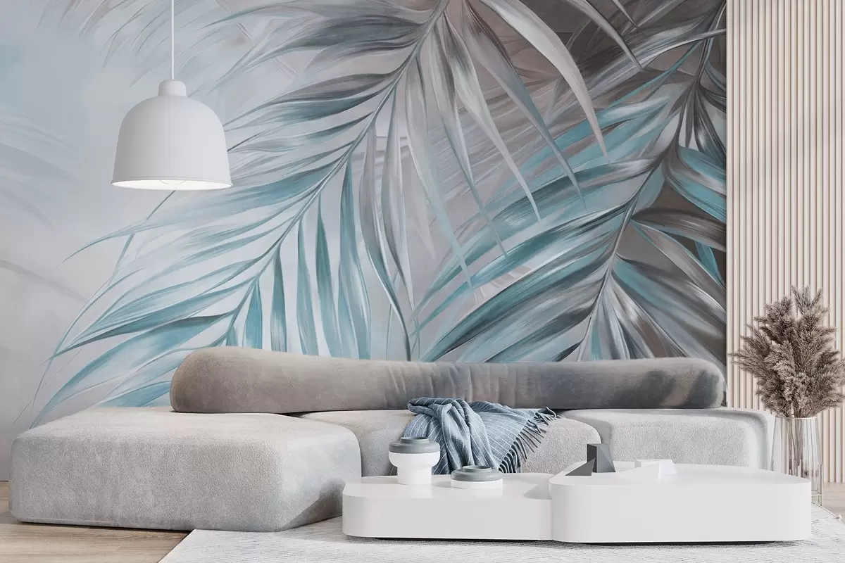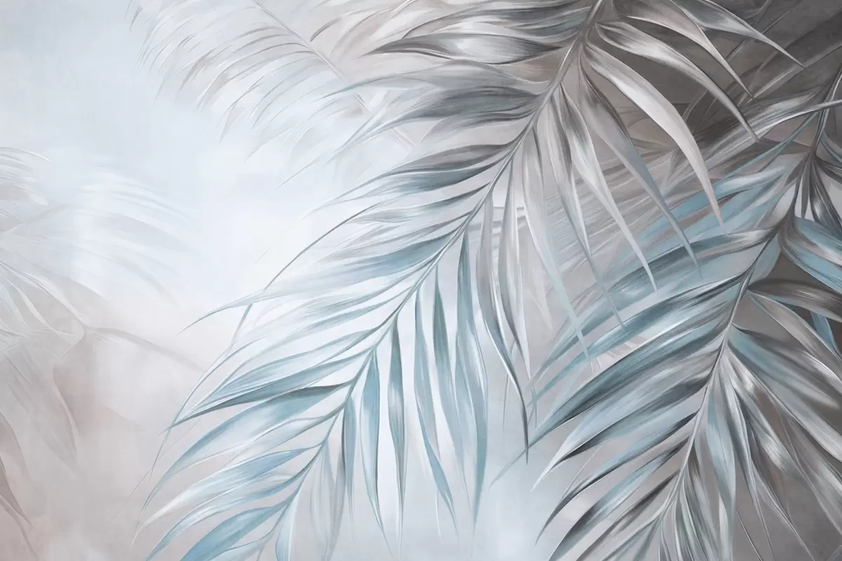 Murais de parede Folhas de palmeira com tons cinza e azul, fundo com textura clara e cores suaves, estilo tropical elegante Nr. w09475v1