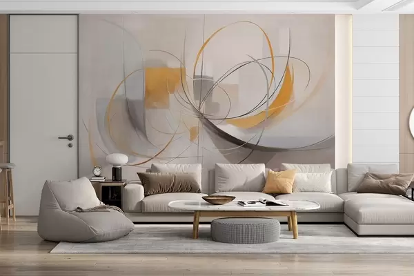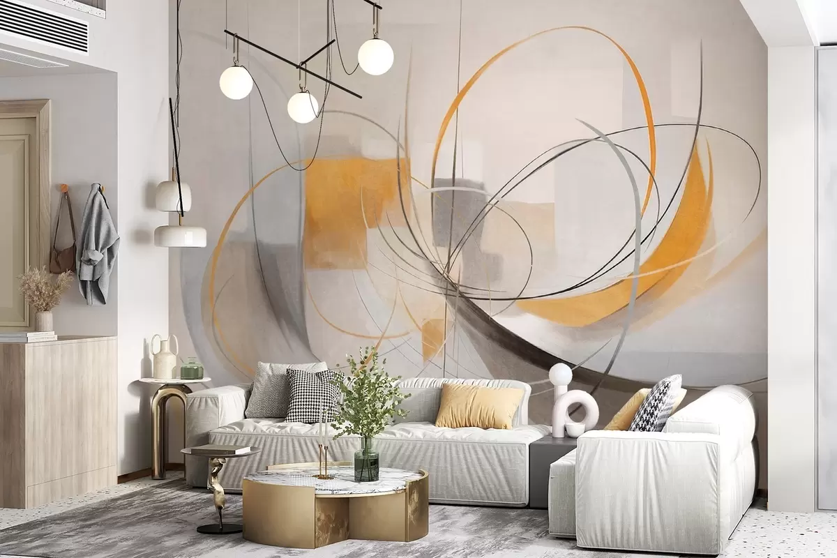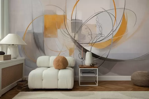 Murais de parede Pintura moderna com textura abstrata, linhas curvas e formas geométricas em tons de cinza, branco e laranja Nr. w09476