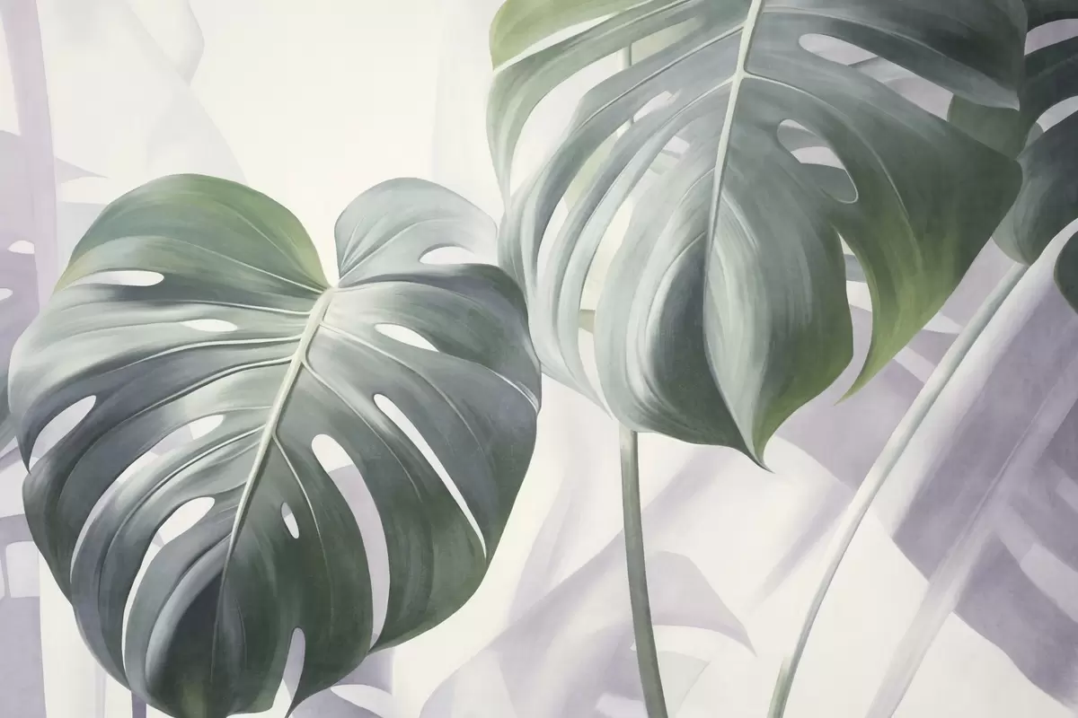 Murais de parede Folhas texturizadas de monstera grandes e verdes, contra um fundo abstrato suave e claro Nr. w09477