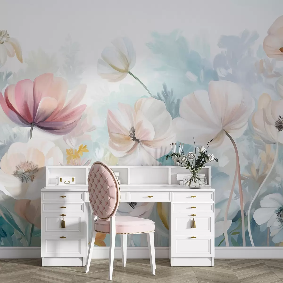 murais de parede Um campo de flores em tons pastel com pétalas delicadas e folhas verdes suaves, num estilo aquarela sonhador e texturado w09481