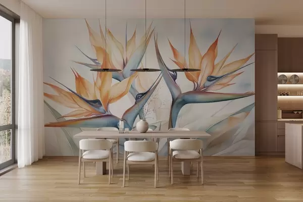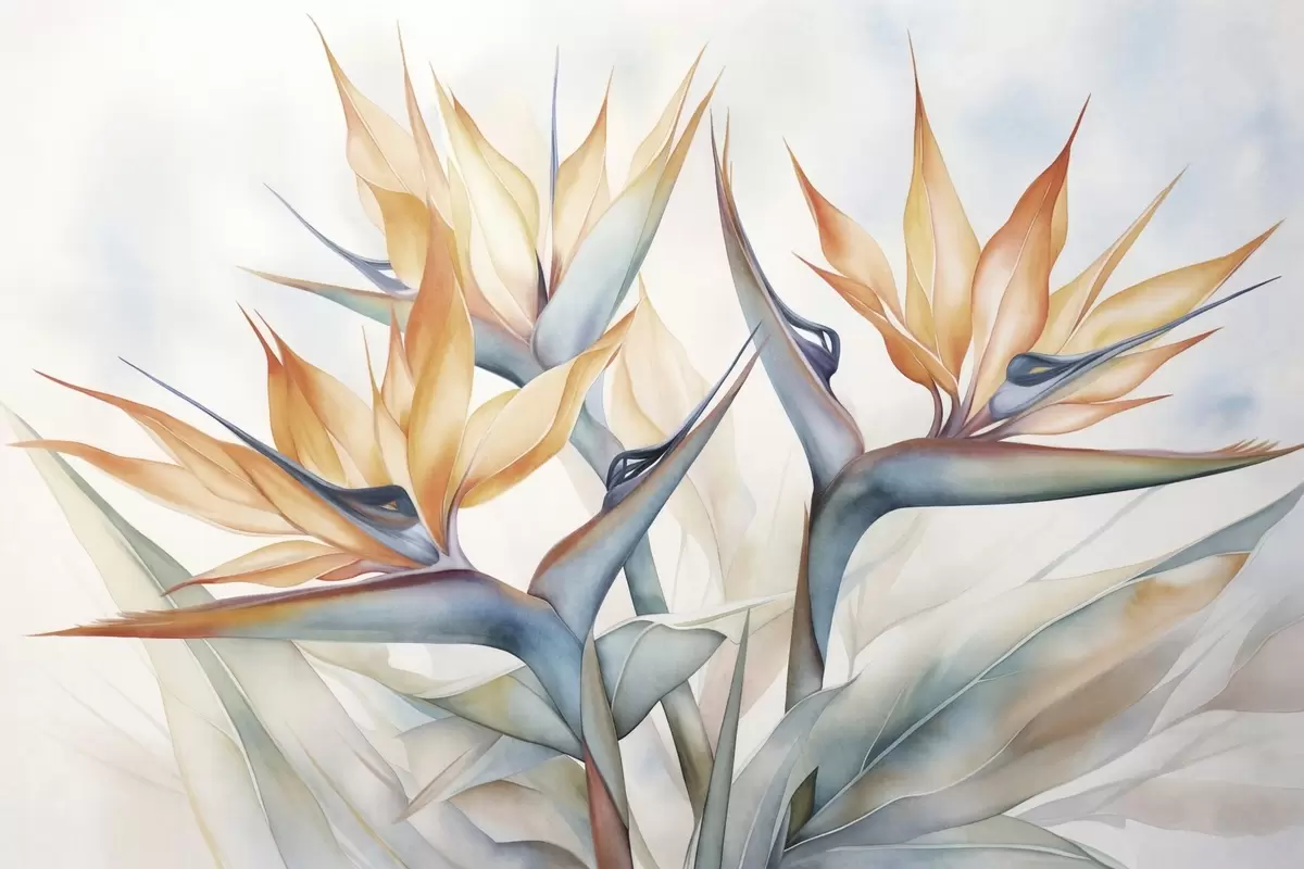 Murais de parede Flor do pássaro do paraíso, strelitzia com pétalas laranja, estilo texturizado em aquarela suave, fundo claro Nr. w09483