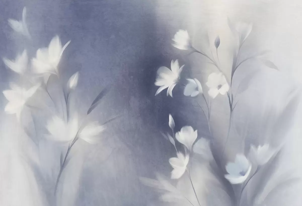 Murais de parede Flores brancas texturizadas com hastes longas, botões macios contra um fundo desfocado de tons azuis e brancos Nr. w09484