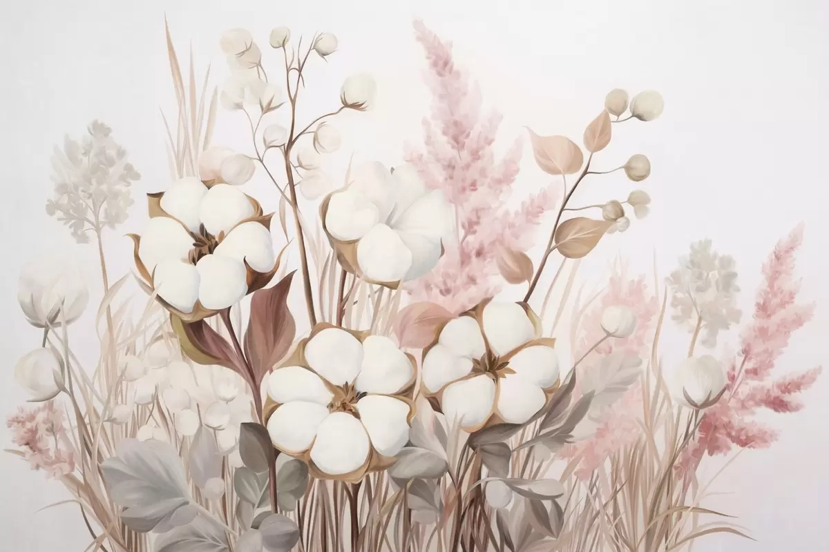 Murais de parede Flores com textura de algodão com capim-dos-pampas branco e rosa, folhas e ervas bege e marrom, fundo branco Nr. w09489