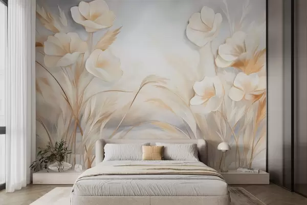Murais de parede Flores brancas, juncos bege e capim-dos-pampas, texturizado, elegante, estilo minimalista, fundo abstrato paisagístico Nr. w09490