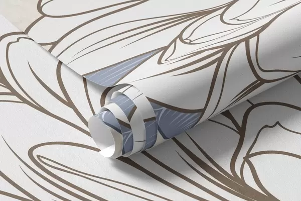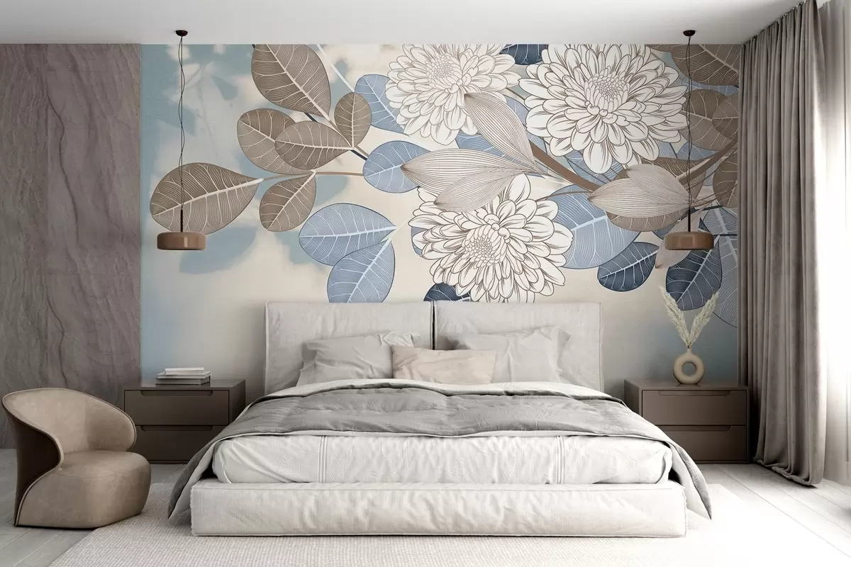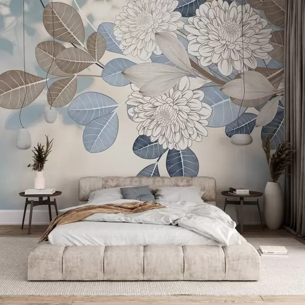 Murais de parede Flores brancas com folhas azuis e marrons, fundo texturizado azul claro, arranjo floral, arte linear detalhada Nr. w09496