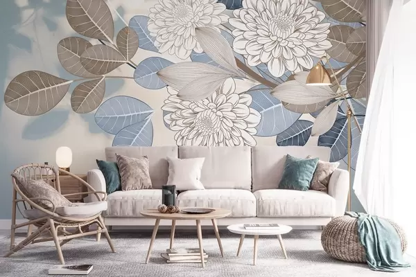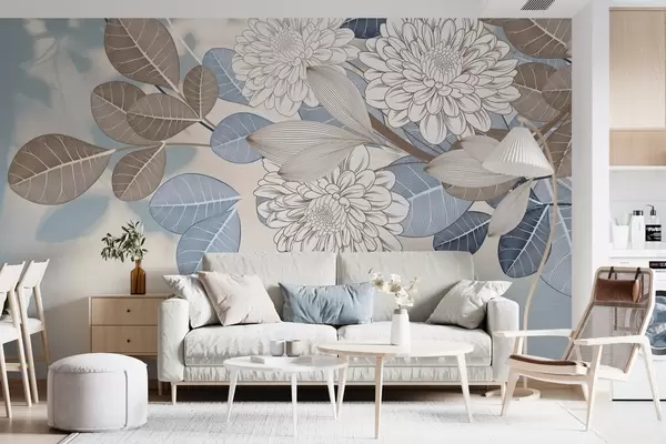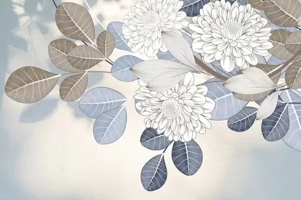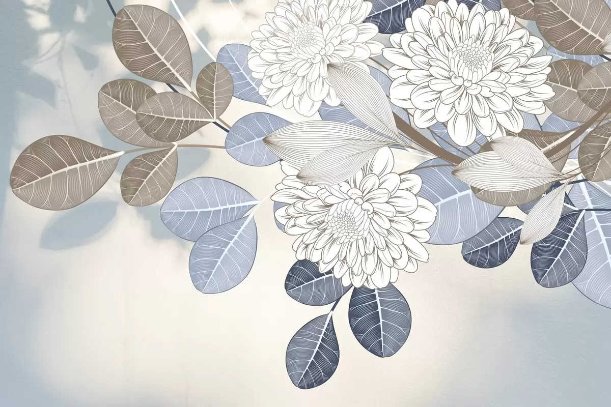 Murais de parede Flores brancas com folhas azuis e marrons, fundo texturizado azul claro, arranjo floral, arte linear detalhada Nr. w09496