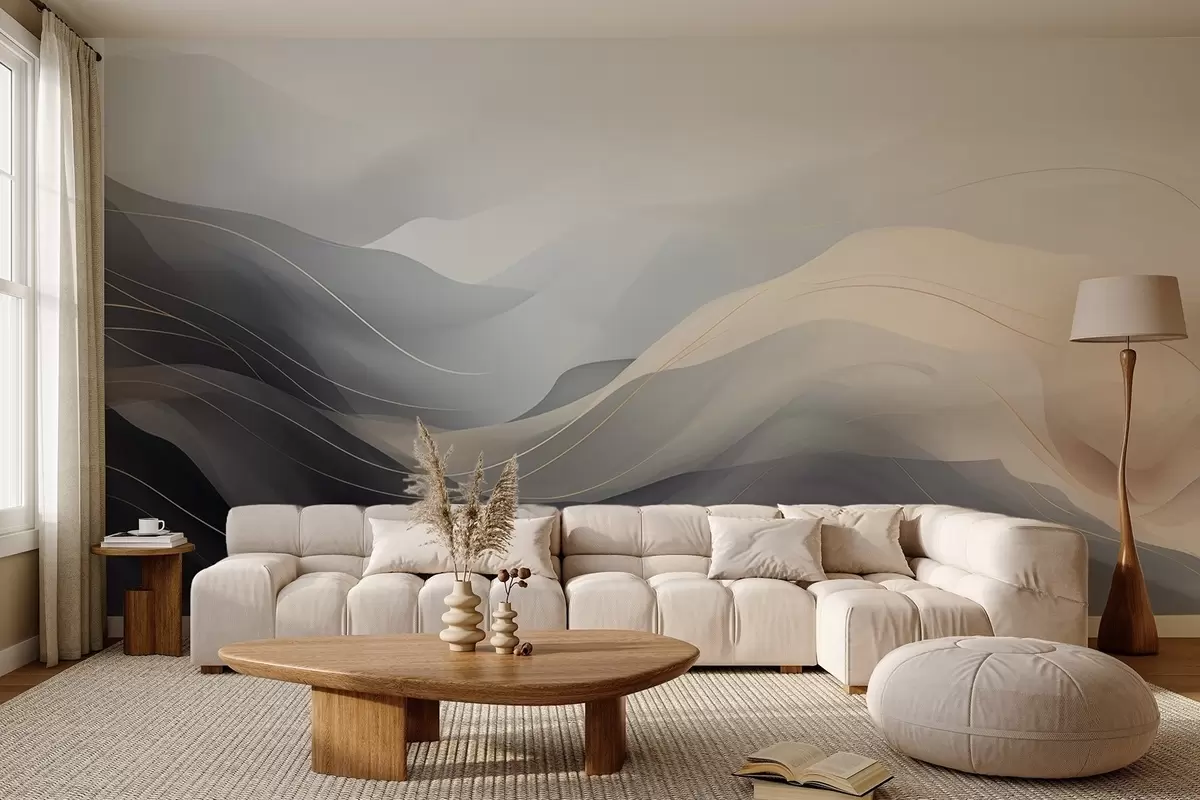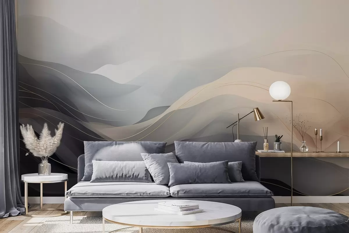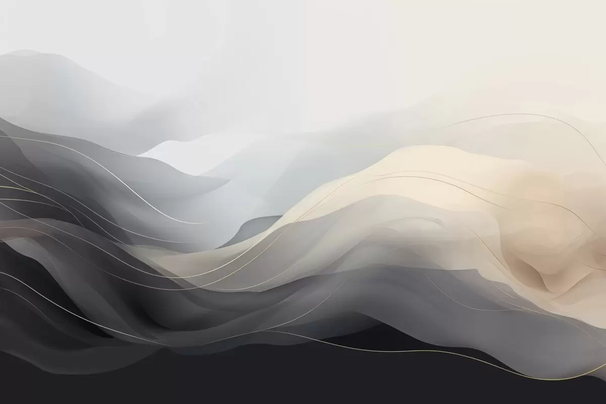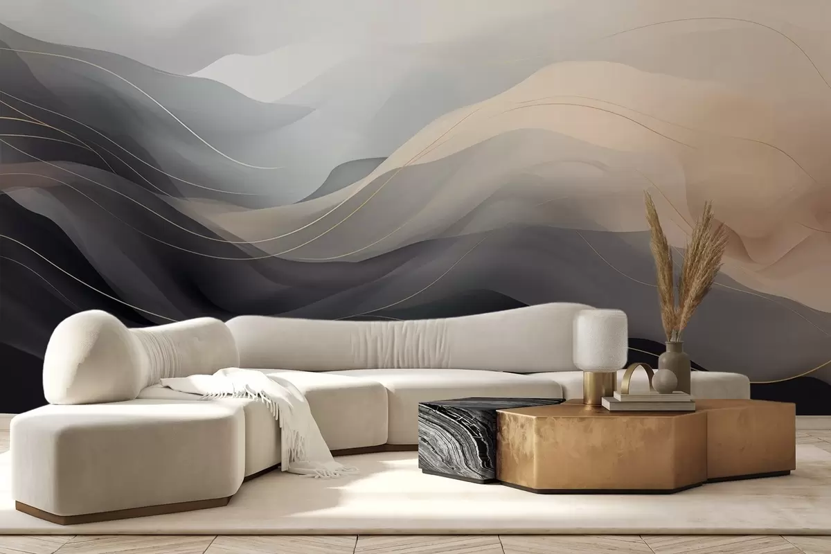 Murais de parede Ondas abstratas e nebulosas em tons de cinza-creme com linhas amarelas Nr. w09504